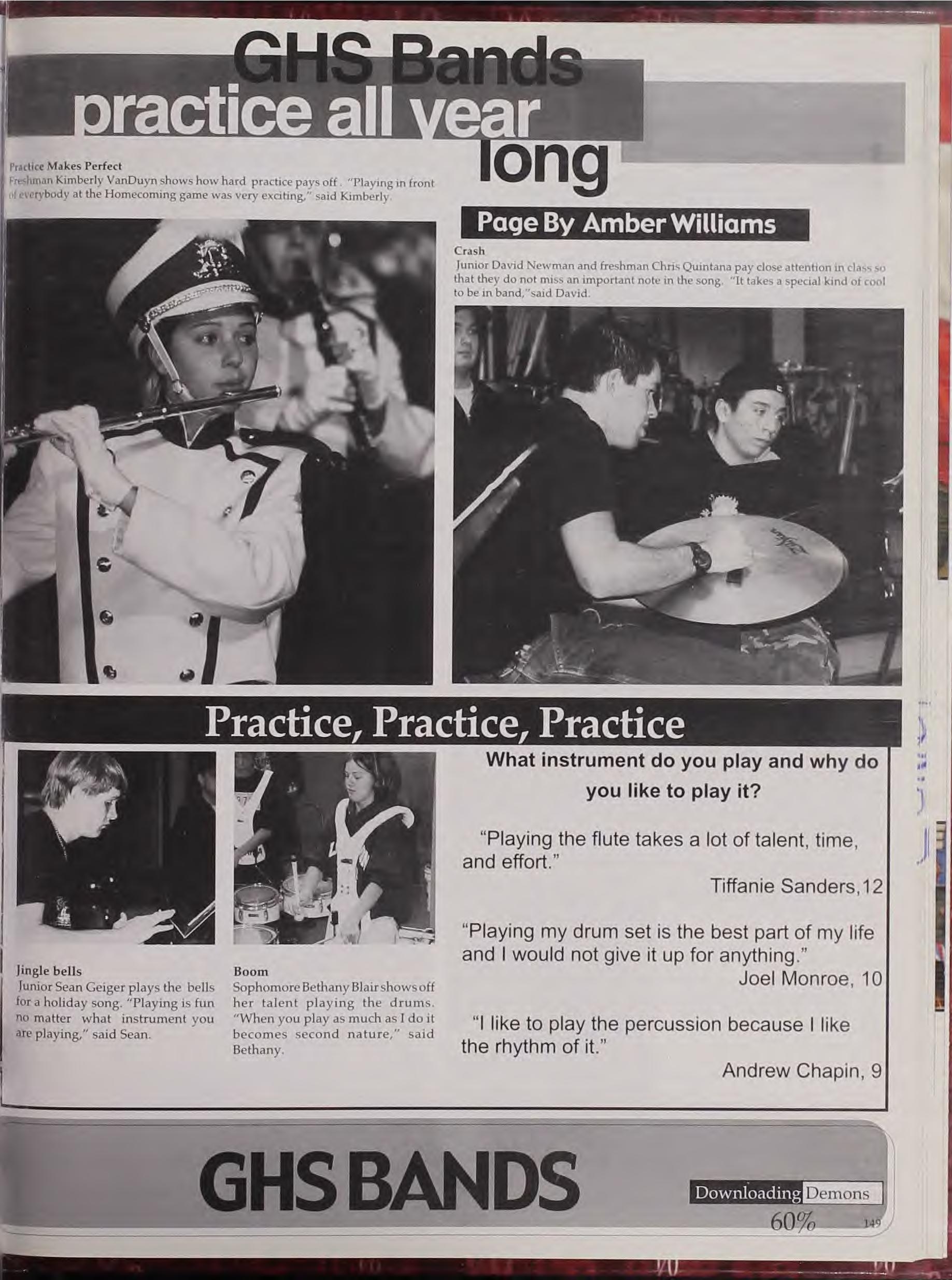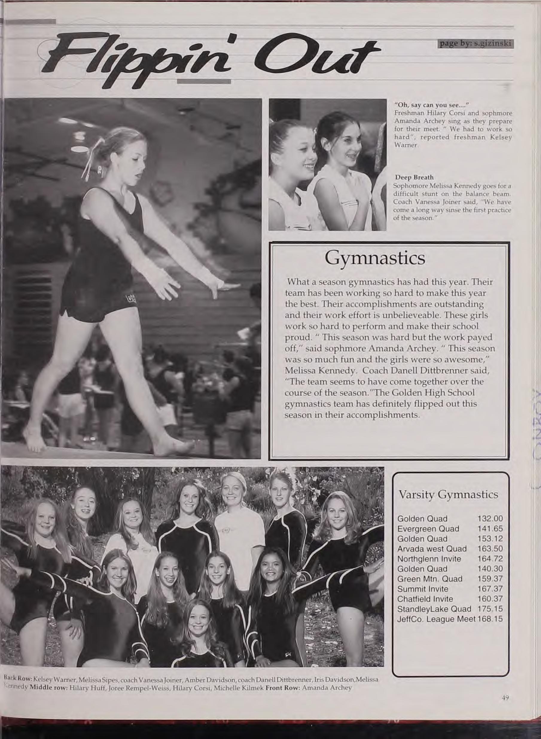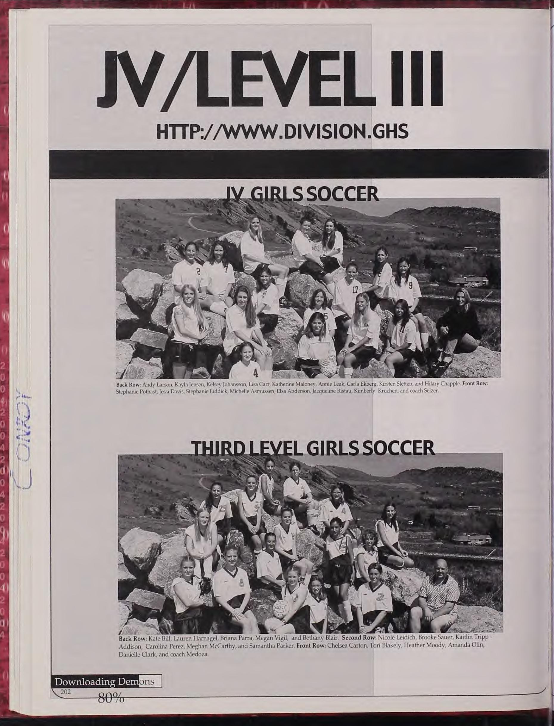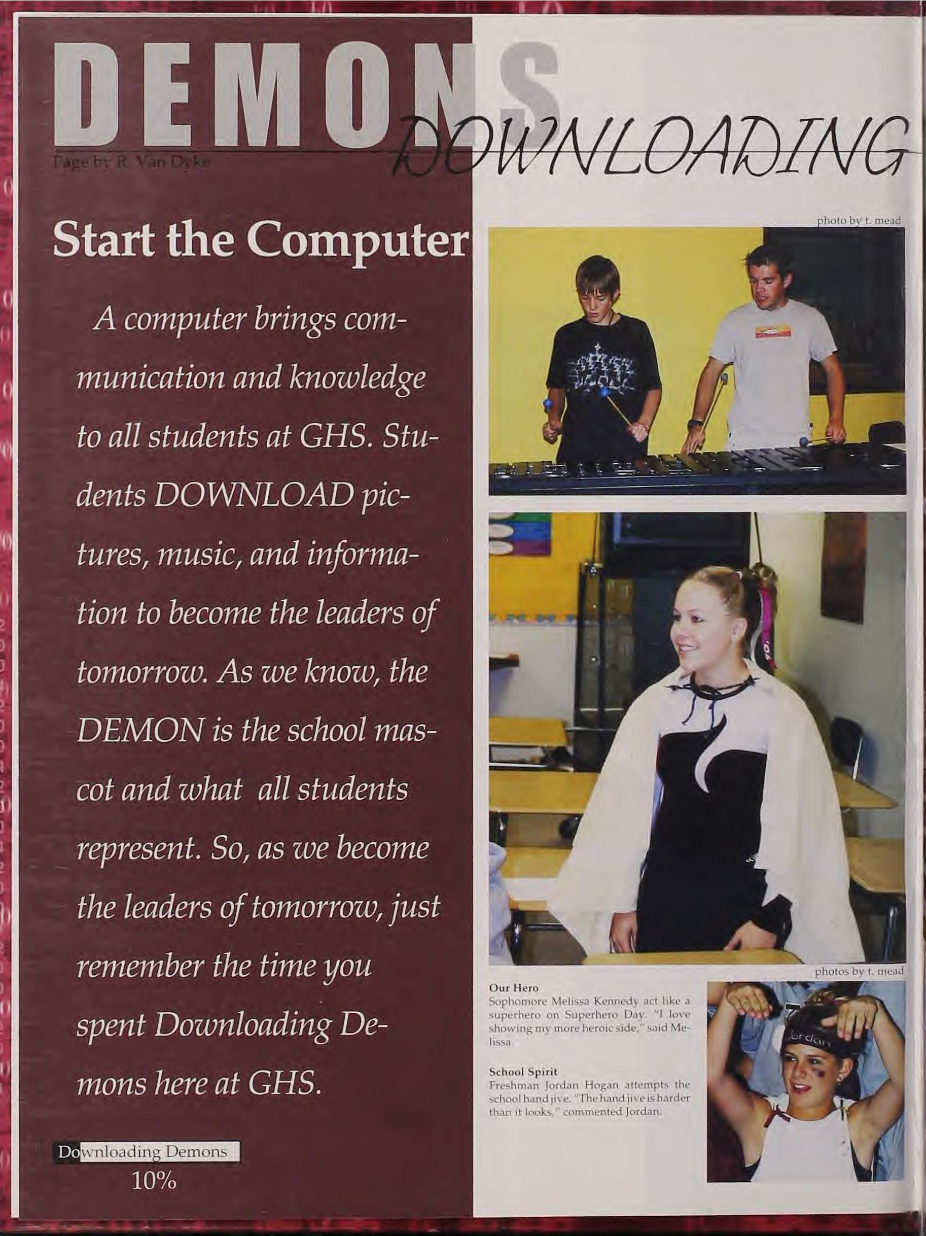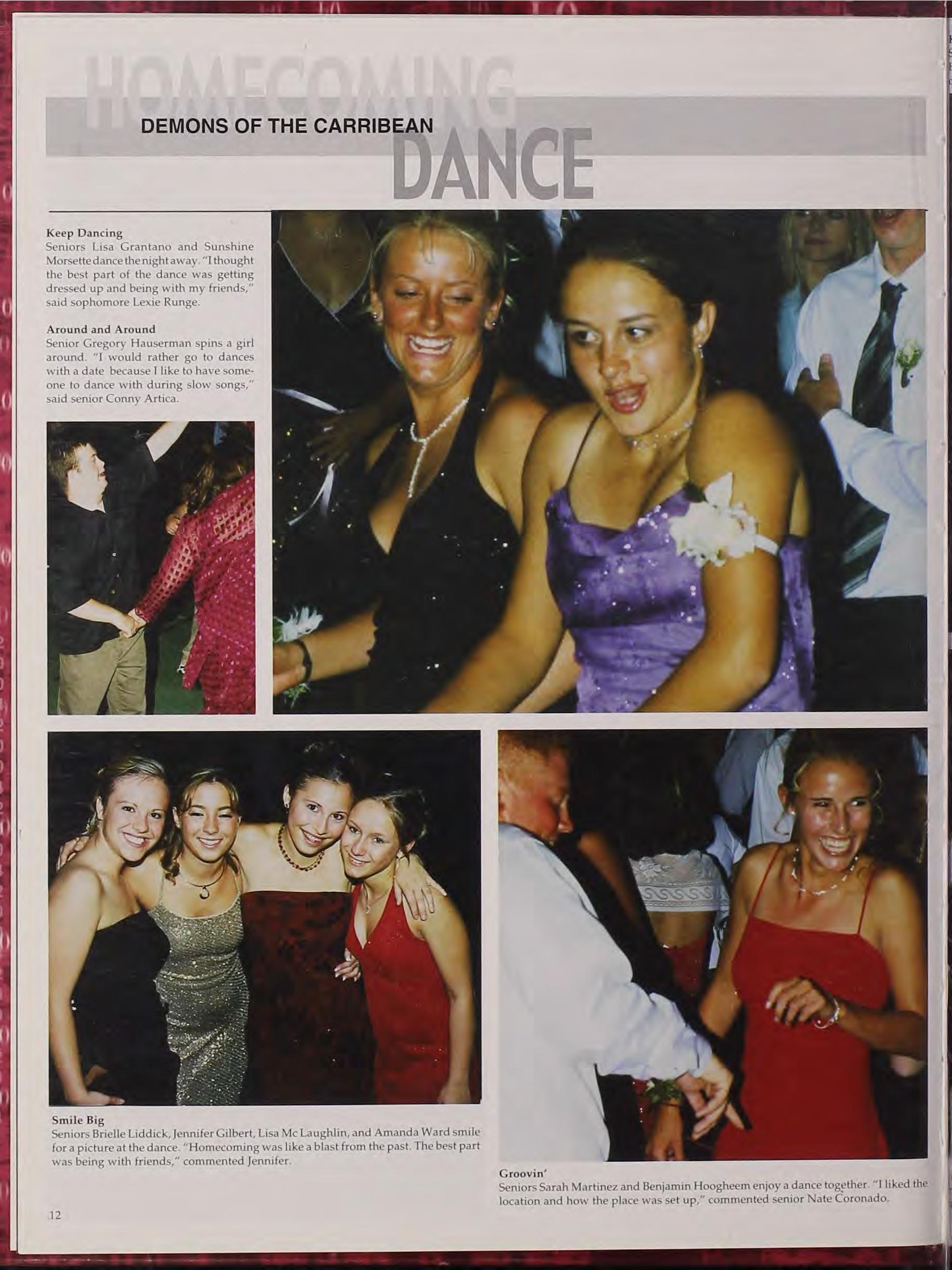 Not very often do you see girls talking and thro\ving aro11nd other girls, but the powderpuff game at this Homecoming carnival ,vas a great place to see it. While some people s ee povvderpuff as just another fun sport to play, otl1ers perfer to watch. "Powderpuff is a great opportunity for females to play football," said senior Diana Sendgraff. Po,vderpuff has al,vay s drawn a big crowd of guys. "I like to watch all the girls rip on each other," said sophomore David Gustafson. The senior of 2004 beat the freshmen and then for a second victory beat the sophomores. The sophomores came in second, the freshmen came in third, and last but not least the juniors came u1 fourth. 0 The Homecoming carnival was a really big success, and spending the time we did setting up ,vas \VOrth all the hard \.Vork ,'' said Student Council member Stephanie Liddick. Before the Homecoming Game, Golden High School l1ad its ann11al pa• rade, which took place in downto"'n Golden. Each cla ss h a d their own float in the parade, ,vhich they rode do\>vn to Brook s Field \A/here the football game took place. Also participating in the Homecoming Parade were the Jeffco High School Rodeo Team, the Drama Club, and the Golden High Dancing Den1on s, to name a few.
