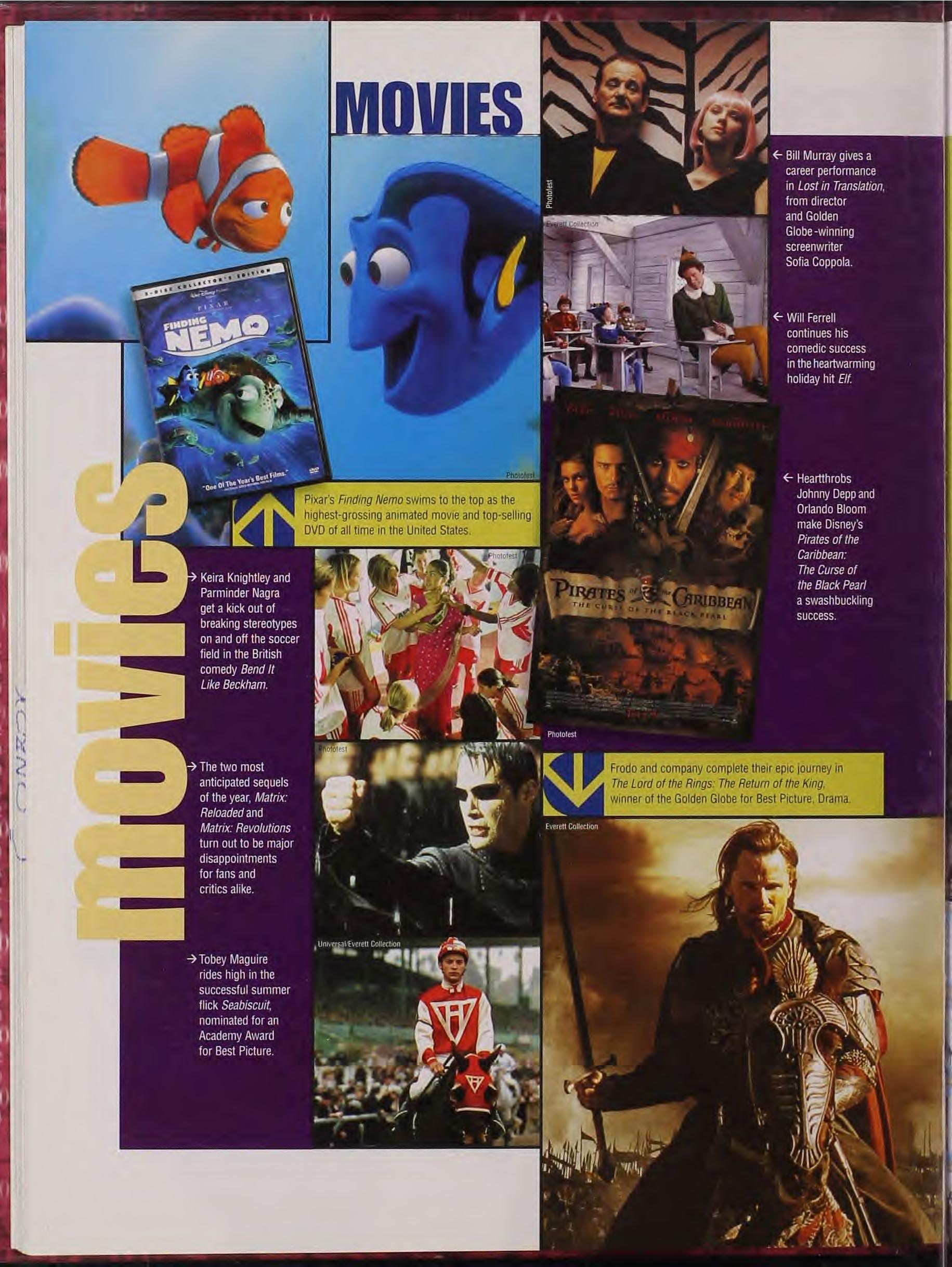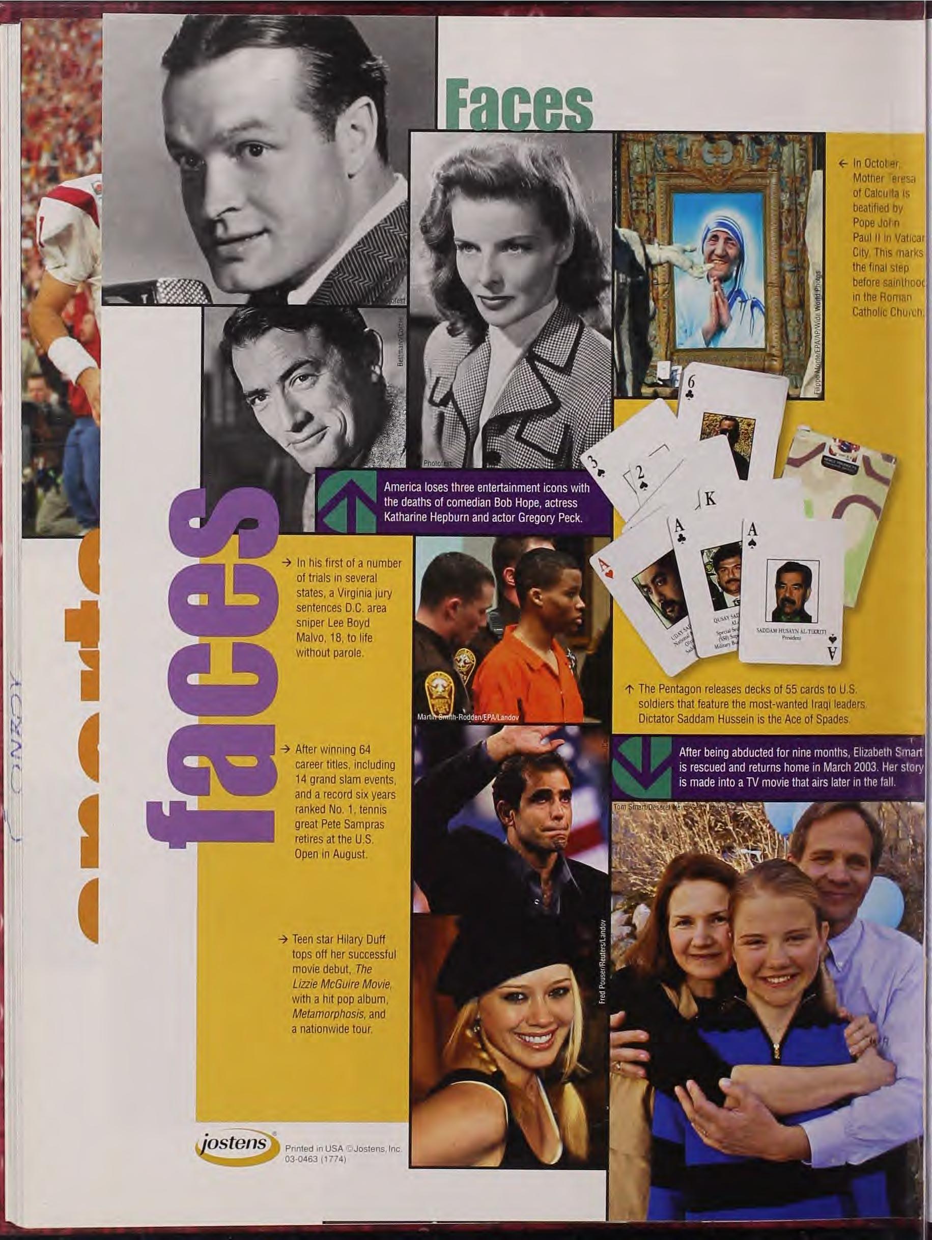 After winning 64 career titles, including 14 grand slam events, and a record six years ranked No 1, tennis great Pete Sampras retires at the U S Open in August. Teen star Hilary Duff tops off her successful movie debut, The Lizzie McGu,re Movie, with a hit pop album , Metamorphosis, and a nationwide tour