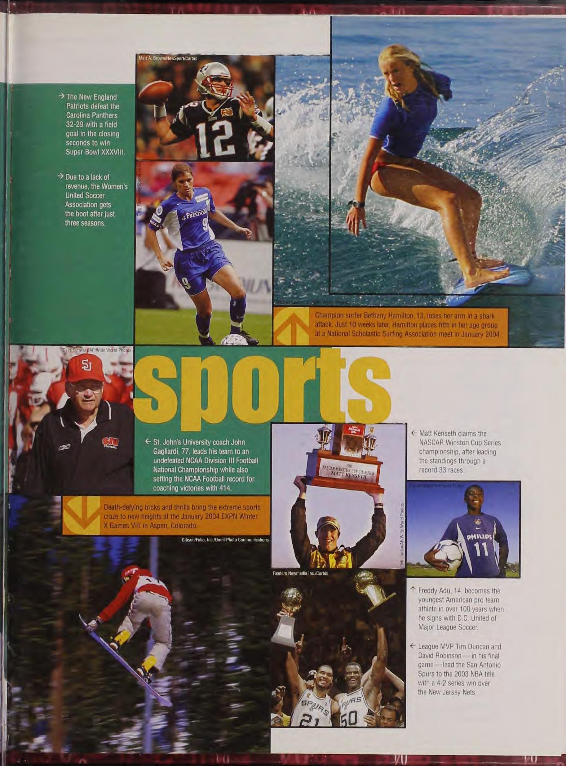 Champion surfer Bethany Hamilton, 13 loses her arm 1n a shark attack. Just 10 weeks later Hamilton places fifth In her age group at a National Scholastic Surfing Assoc1at1on meet 1n January 2004