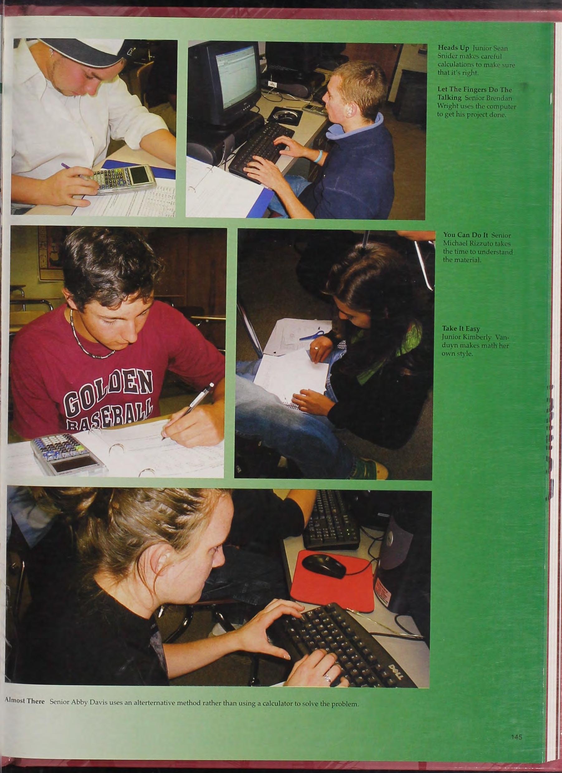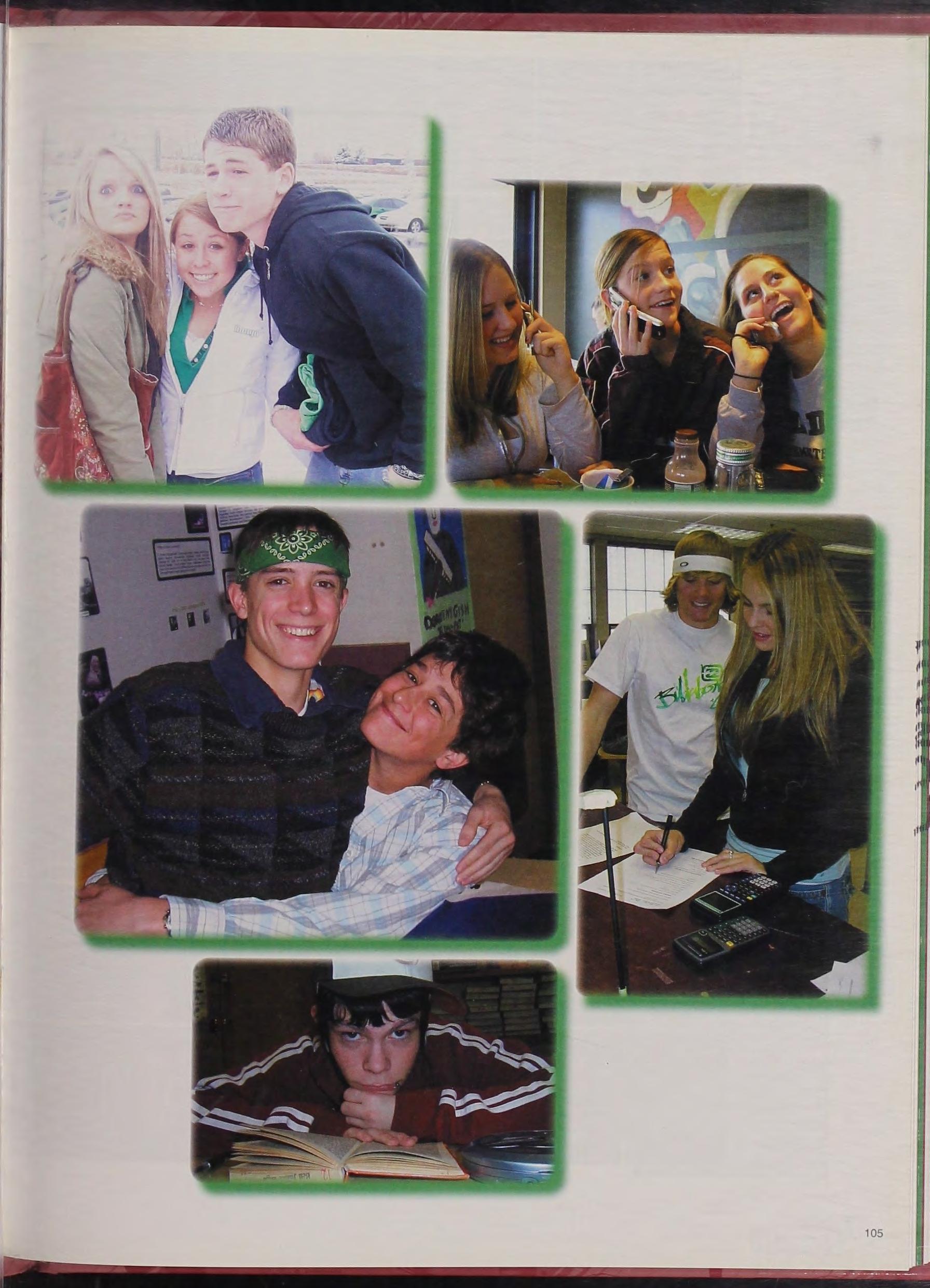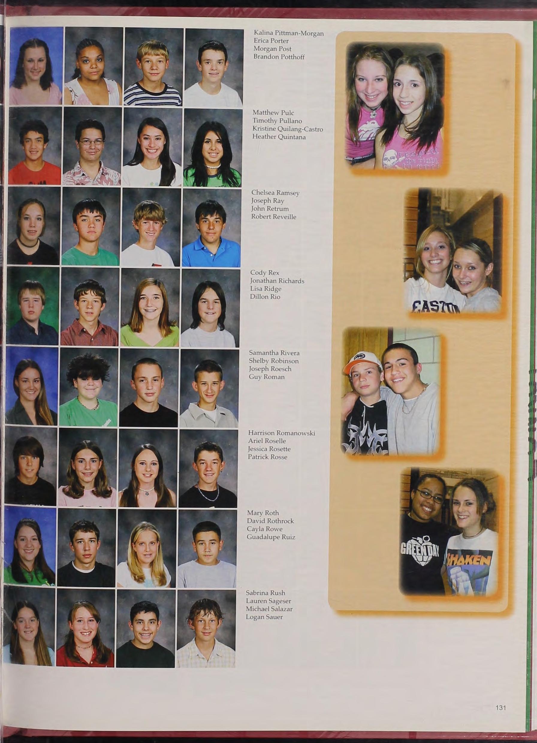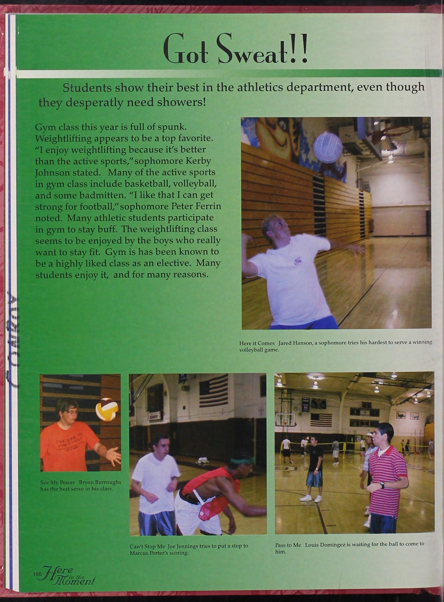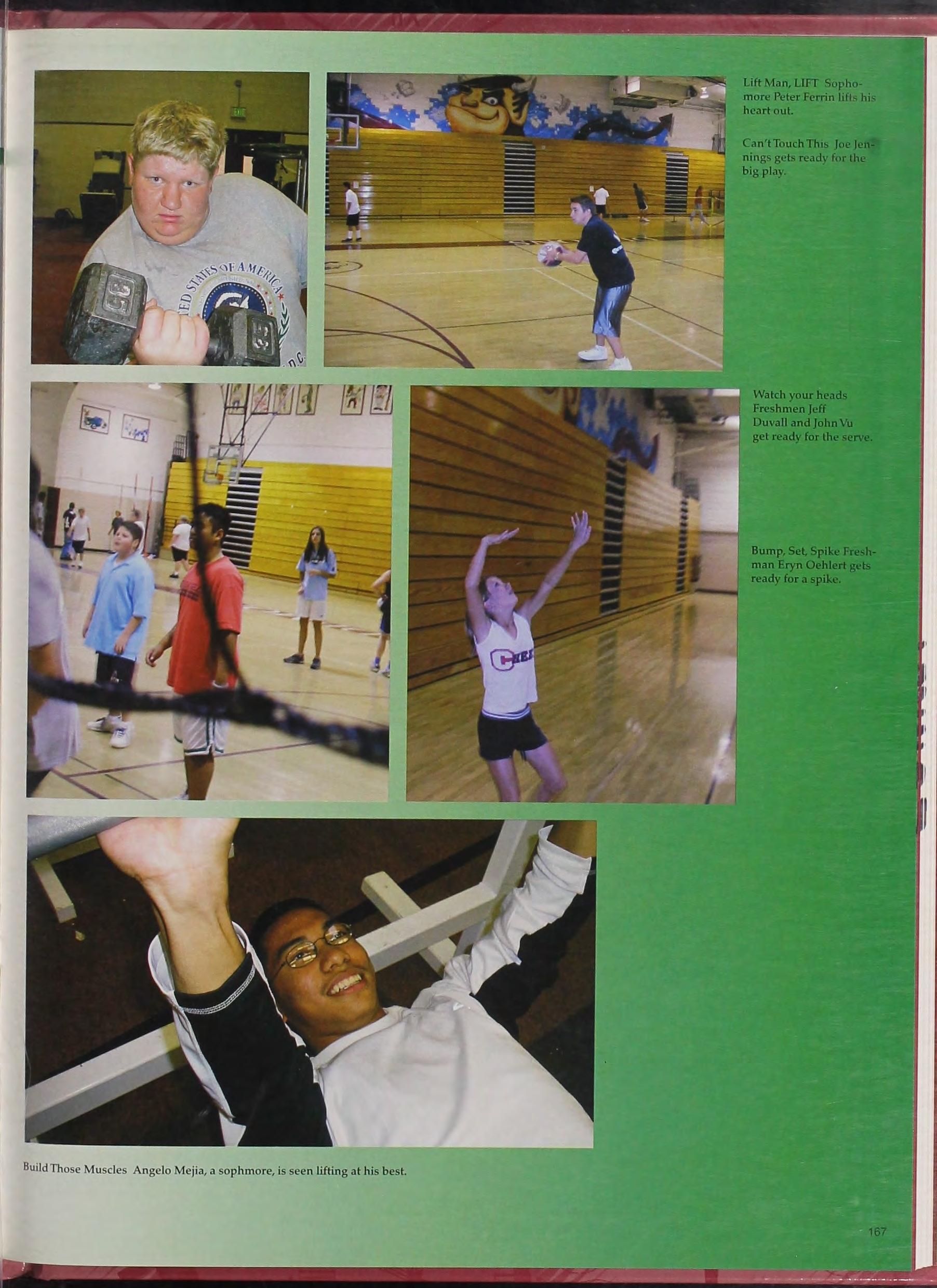 Grr Sophomores 1\nthony ~!organ, ~lcagan Padilla, and Mike Gagnon s ho," their muscles and school spirit in front of the school.
