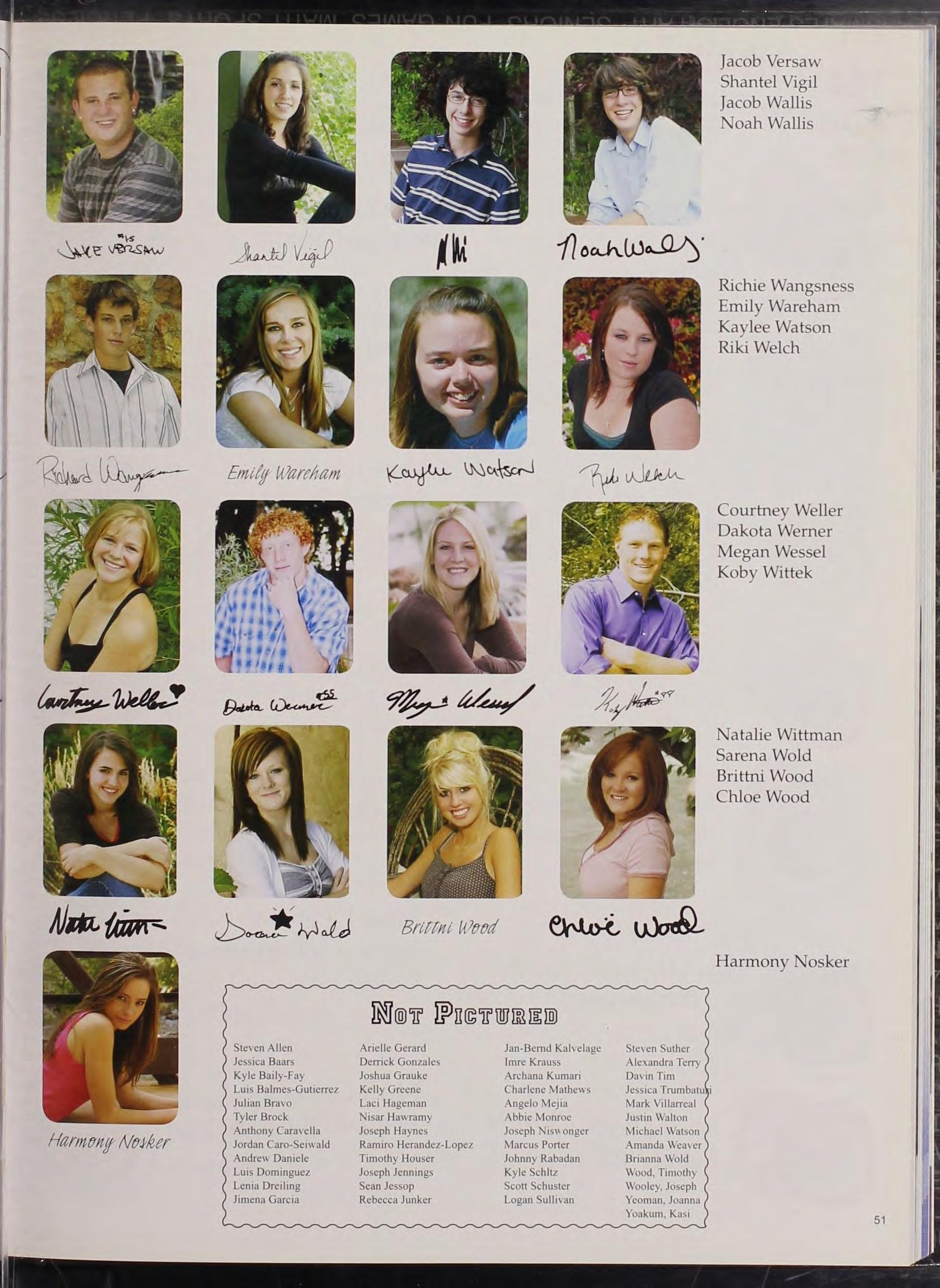 Wang s ness , Richie 51 , 128 Ward , Joshua 68 Wareham , Emily 32 , 51 Warren , Matthew 68 Watson , Kaylee 51 Watson , Michael 51 Wehl i ng , Sarah 79 Weiman , J i ll 87 Weiman , Julia 87 We i ngardt , Michael 79 Weir, Zachary 87 Welch , Bo 87 Welch , R1k1 51 , 154 Weller, Courtney 32 , 51 , 193 Wells , Br ion na 8 , 24 , 68 , 126, 157 Well s, John 87 , 146 Wendel i n , Cyna 79 , 154 Wernars , Hendrik 87 Werner, Dakota 7 , 14, 51 , 157 Werner, Mar i ah 79 , 149 We sse l , Megan30 , 51 , 128 , 148, 157 , 193 West , Bnana 79 , 1 28 Westbrook, Andrea 87 Westbrook, Ashley 79 Westerkamp , Scott 26 Weymouth , Sabrina 87 White , Bri ttney 87 , 154 Wiederspahn , Jacob 87 Wilkins , Myriah 79 Wilk i nson , Carolyn 12 , 87 , 157 Wilkinson , Holly 87 Wilkinson , Stormy 68 Willey, Kevin 79 Williams, Kacy 79 Williams , Wyndam 82 , 87 Williamson , Ho lly 68 , 127 Willis , Jessica 68, 1 20 , 121 Wilson , Andrew 68 Wineland , Brook 87 , 110, 111 Winkler, Eric 68 Winzent , Derek 87 Wise, Brittany 87 Wittek , Koby 8 , 15 , 51 , 103 Wittek , Tanner 68, 127 Witters H icks , Kynan 79 Witthohn , Leah 79, 157 Wittman , Natalie 51 , 193 Wold , Sarena 51 , 193 Wolf , Brandon 79 Wolken , Andrew 87 Wood , Brittni 51 Wood , Chloe 30 , 51 , 148 , 194 Wood , Marilyn 79 , 127, 129 Wouk, J ordana 79 , 157 Wunderle, Shelby 68 , 129 , 157 Wynn , Britainy 68 , 128 y Yeoman, Joanna 51 Yoakum , Kasi. 51 Young , Alyssa 79 , 128 , 149 Young , Tyler 87 Young , Winona 87 , 155 Yushka , Branden 68 Yushka , Evan 87
