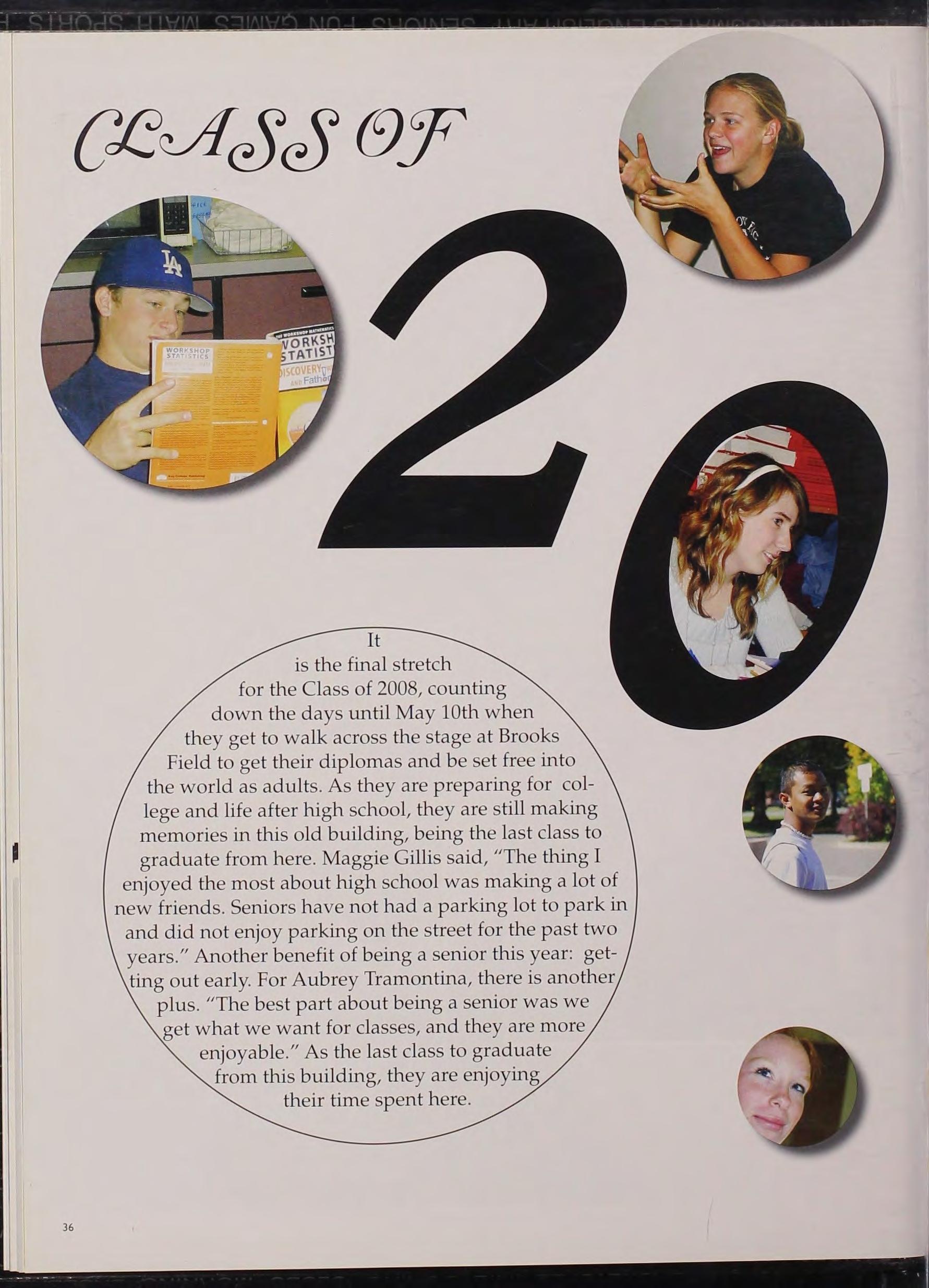 It is the final stre tch for the Class of 2008, co unting down th e d ays until Ma y 10th when th ey ge t to walk across the s ta ge at Brooks Field to ge t th e ir diplom as and b e se t fr ee into the world as adults. As they are preparing for co ll ege and life after high school , th ey are s till making m e mori es in this old building, being the last class to graduate from here. Maggie Gillis sa id, '' The thing I e njoy e d th e mo s t about high school was making a lot of new friends. Seniors have not h a d a parking lot to park in and did not enjoy parking on the s treet for the past two years." Another benefit of being a senior thi s year: getting out ea rly. For Aubrey Tramontina, there is another plus. ''The be st part about being a senior was we get what we want for classes, and they are n1ore enjoyable." As the la s t class to graduate from thi s building, they are enjoying their time spent here .