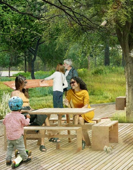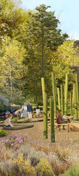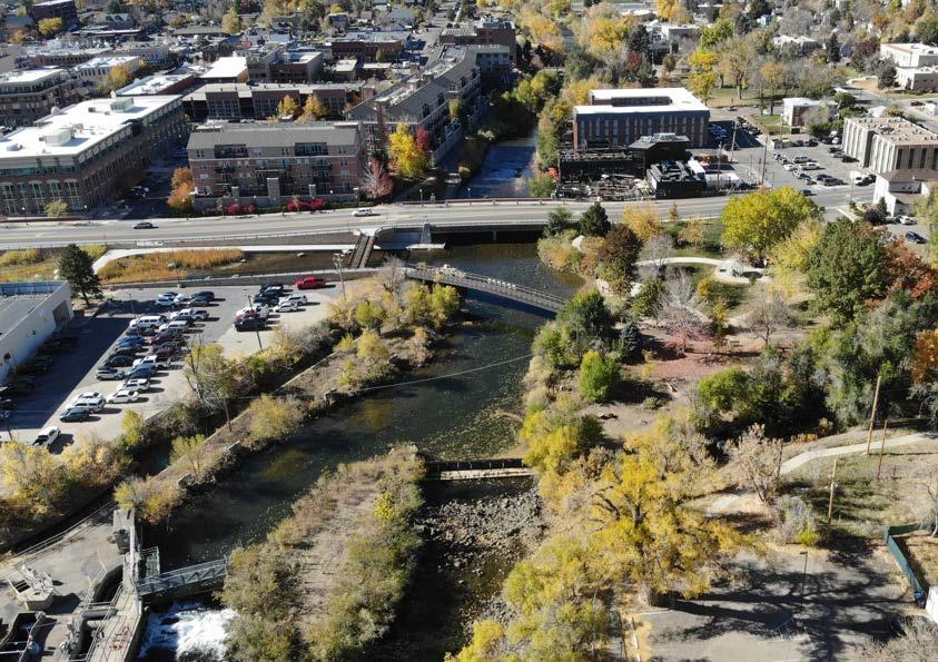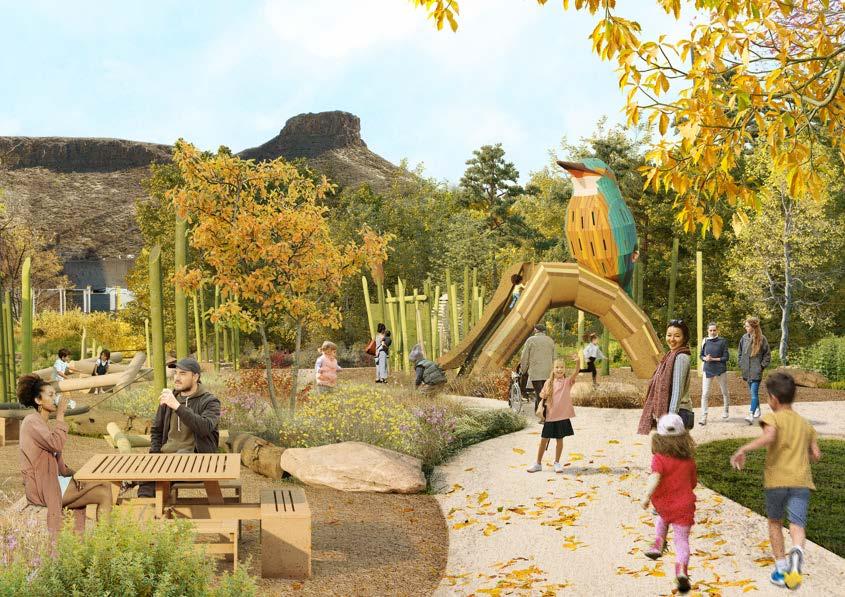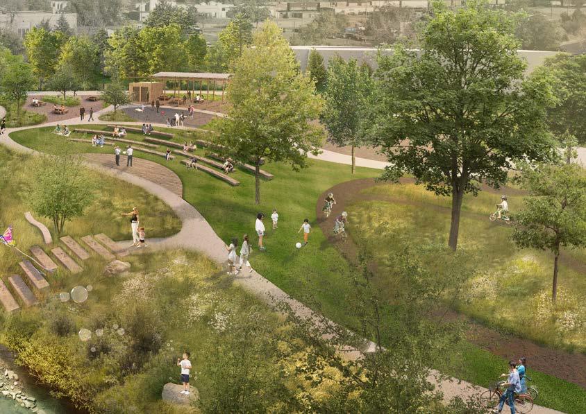 Vanover Park will become a vibrant, natureinspired destination where families can engage with the creek and the surrounding landscape. A new play area, inspired by the riparian environment, will feature climbing structures, balance elements, and a sculptural play tower shaped like a native bird or insect. Natural materials, native plants, and shaded seating will create a playful atmosphere deeply connected to Golden’s ecology. With views of the foothills and direct access to Clear Creek, the park will serve as an energetic entryway to the water and the broader Heart of Golden park system.