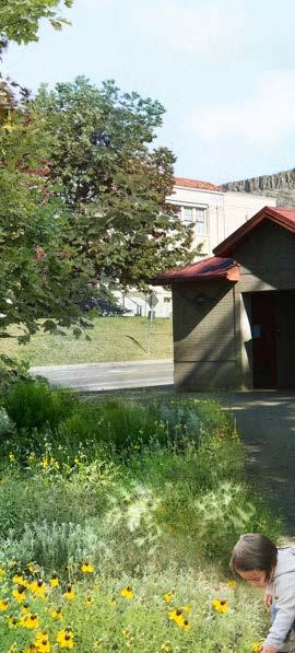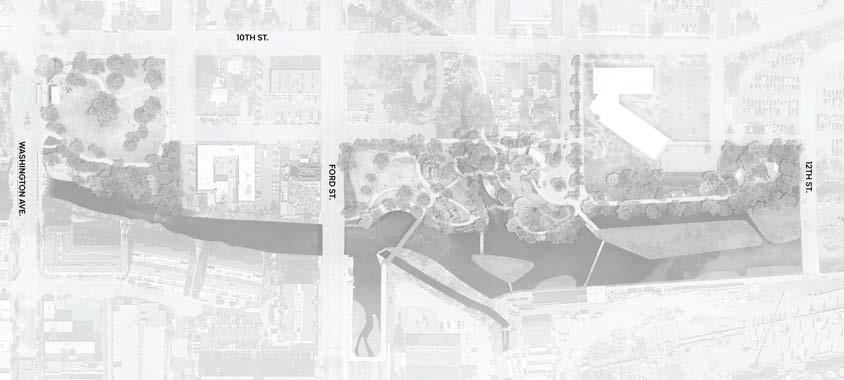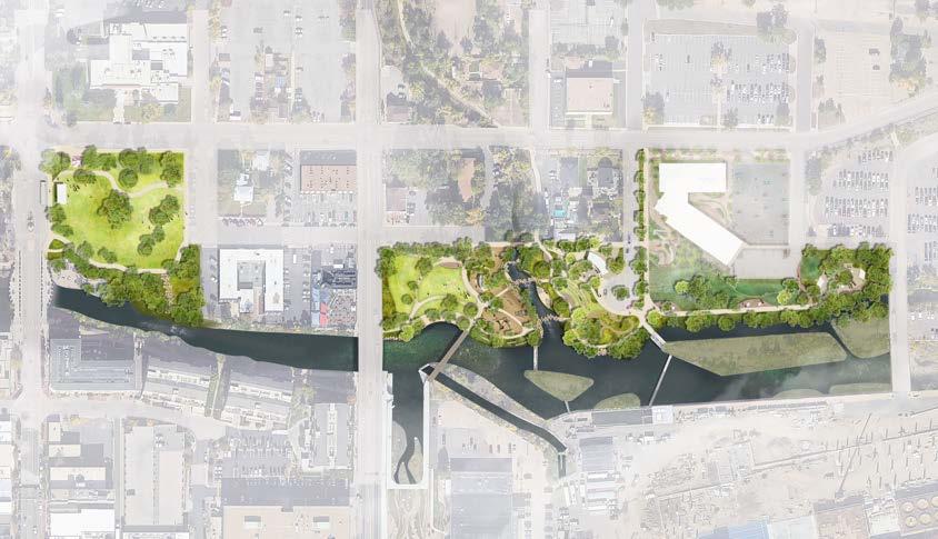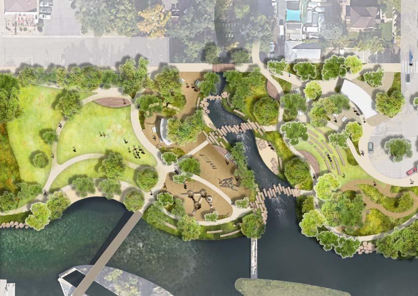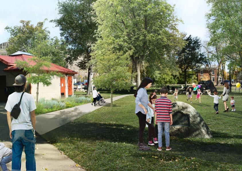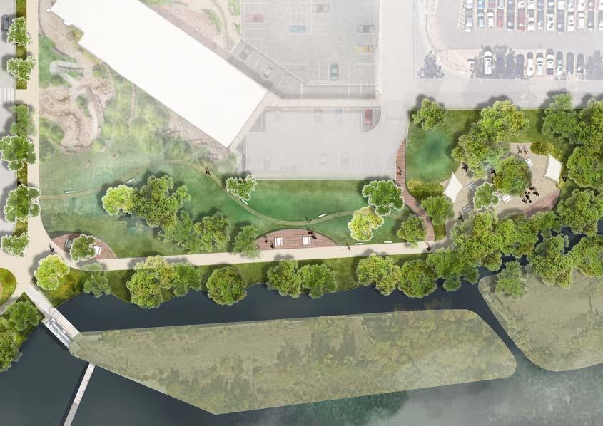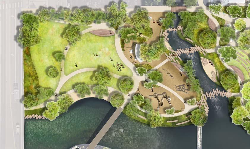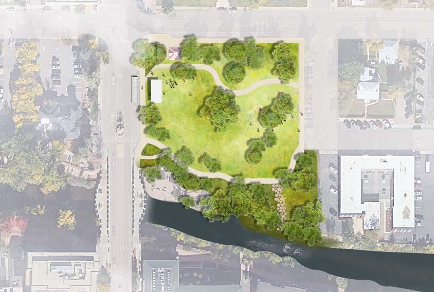 easier, and more enjoyable, creating a seamless experience along the creek corridor. Thoughtfully placed native plantings at the edges of the lawn will support pollinators and bring visitors closer to nature without reducing the park’s usable space. A new creek access point will offer even more ways for people to connect with the water, and a small transportation hub at Washington Ave. and 10th Street will provide a convenient stop for buses and shuttles, helping to reduce congestion and idling on the City’s main streets.
