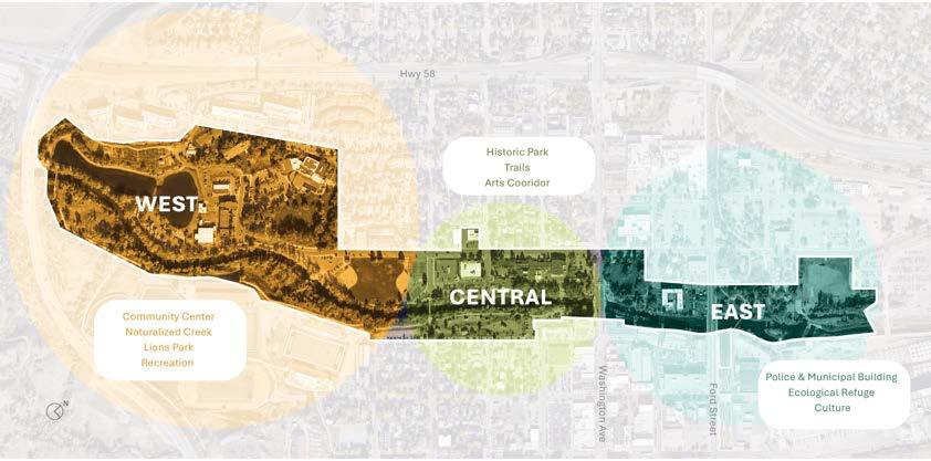 The study area contains signature assets—Parfet and Vanover Parks, continuous creek frontage, and adjacency to downtown—but their fragmentation diminishes overall impact. By clarifying trail connections and crossings, elevating underutilized parcels, and making the creek more visible and accessible from surrounding blocks, the East Zone can become a cohesive civic and ecological corridor that supports residents’ daily life while welcoming visitors.