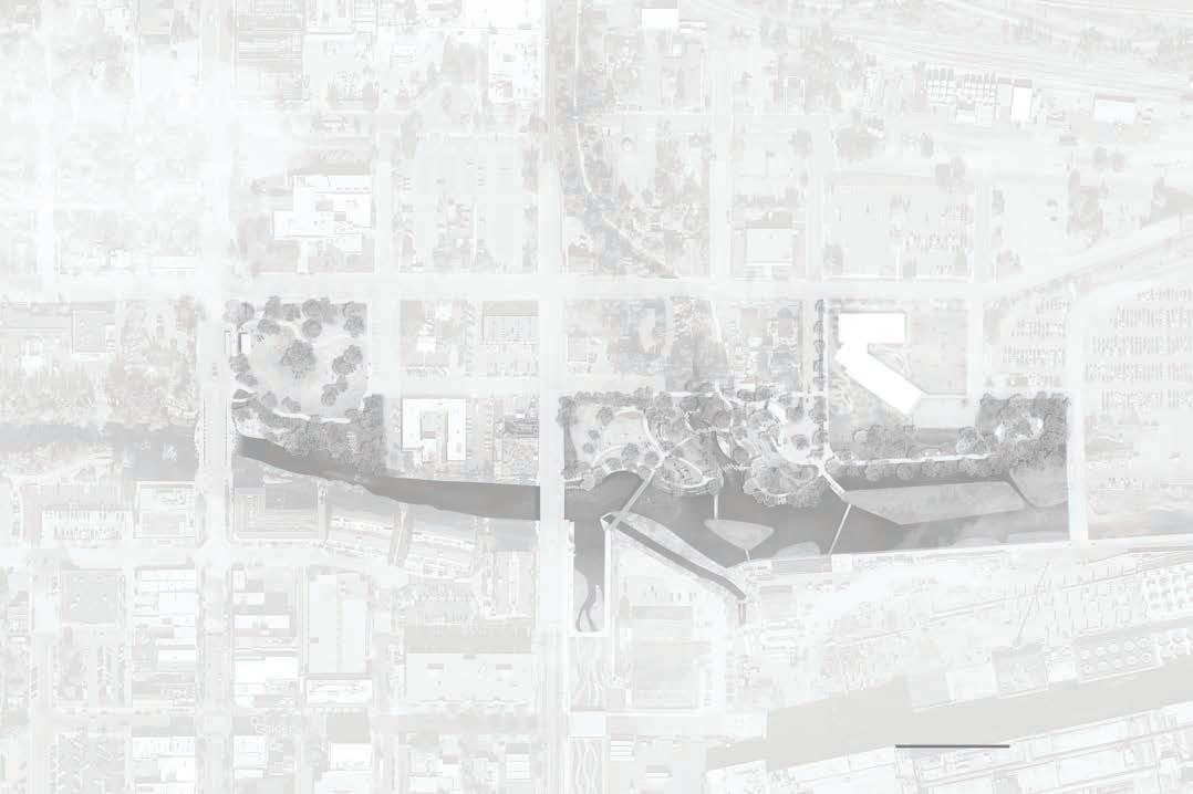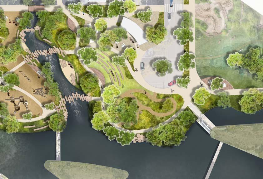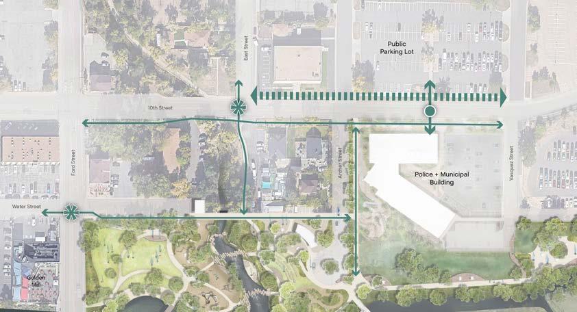 • Clear crossings, upgraded trail continuity, and direct civic-to-creek access.