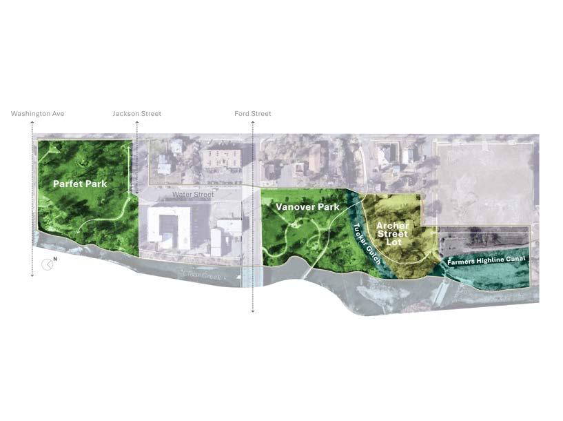 The Archer Street lot and adjacent Tucker Gulch currently serve overflow and back-of-house functions but occupy a pivotal location where neighborhood access, trail movement, and riparian habitat could all be strengthened. At the eastern edge, the Farmers Highline Canal is an undercelebrated water feature with potential to extend ecological restoration and recreational networks into the city’s fabric.