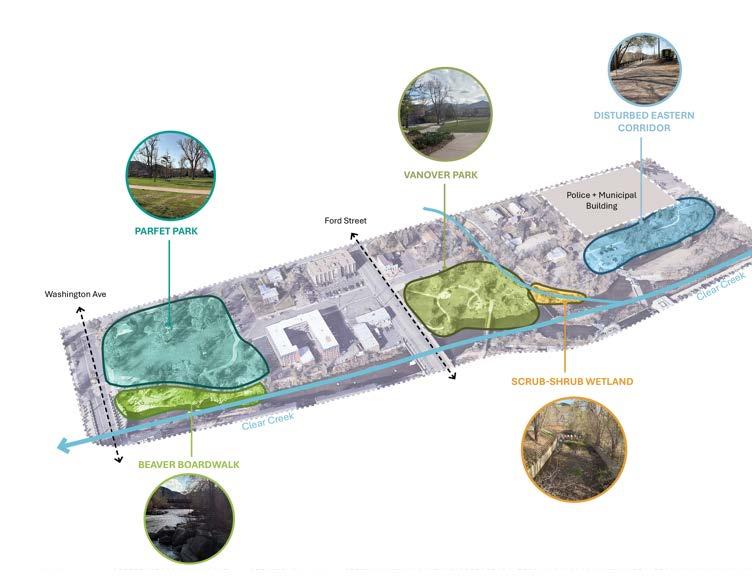 (Right) Key parks, civic edges, and underutilized parcels define a corridor with high potential for improved access, trail continuity, and stronger ecological relationships along Clear Creek.