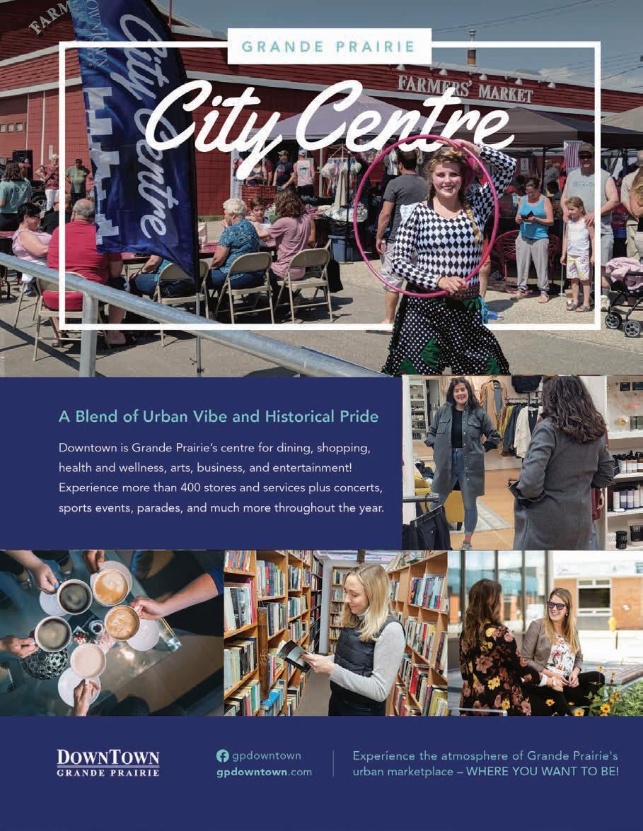 Downtown is the financial, commercial and cultural centre of Grande Prairie. It is home to more than 400 establishments ranging from banks to unique clothing boutiques, furniture stores and diverse restaurants. The Farmers’ Market offers a selection of hand-crafted and locally-grown products yearround while the Grant Berg Gallery carries original works of art from local and Canadian artists. gpdowntown.com