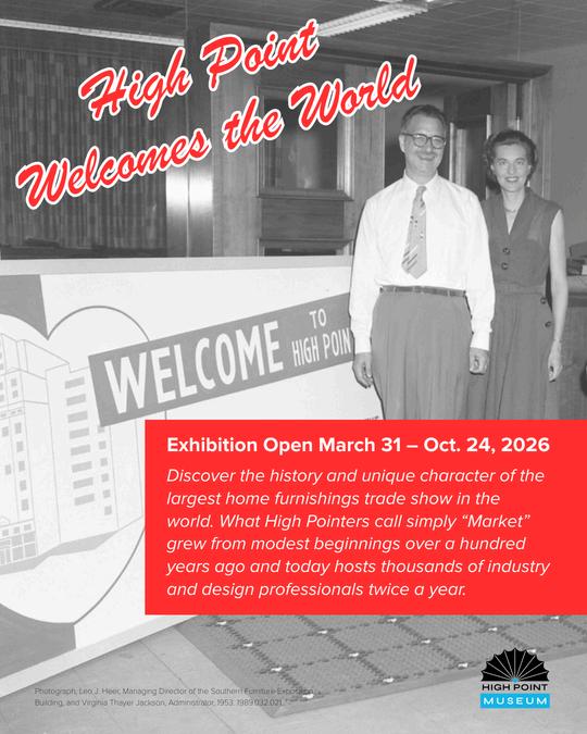 The High Point Museum is hosting “High Point Welcomes the World, ” an exhibition exploring the history and impact of the High Point Market. The exhibition is open from March 31 – Oct. 24, 2026.