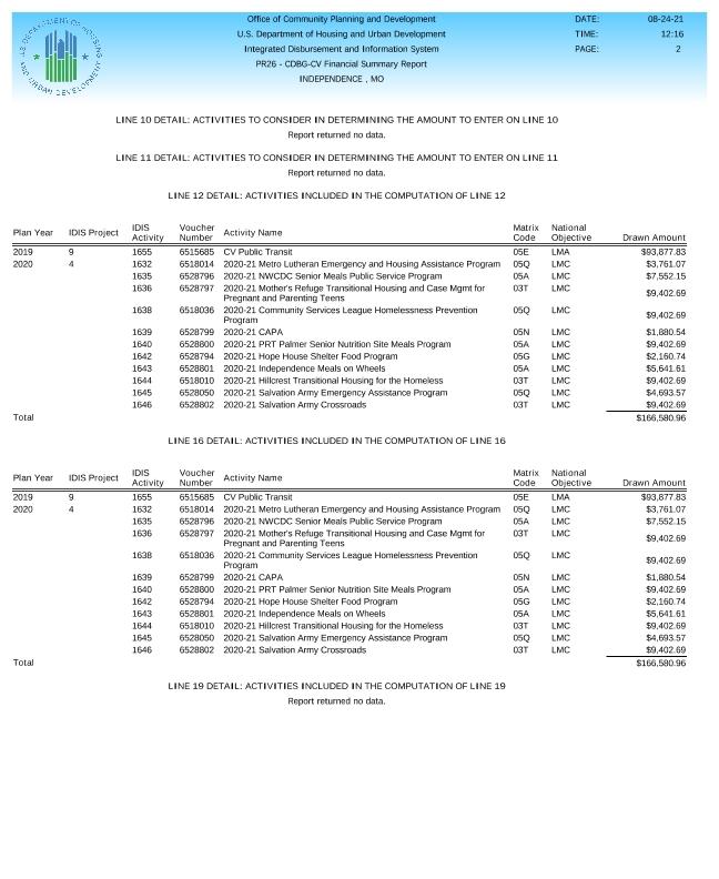The public comment period for the 2020 CAPER will begin August 26, 2021, with a legal advertisement in the Independence Examiner and will be concluded September 25, 2021. The public will be encouraged to give comments regarding the CDBG program as a whole and the CAPER for 2020. All proposed actions under the Entitlement Program were reviewed for compliance under HUD regulations, specifically that they meet a national objective, constitute an eligible activity, and address one of the goals established by the City within its Consolidated Plan.