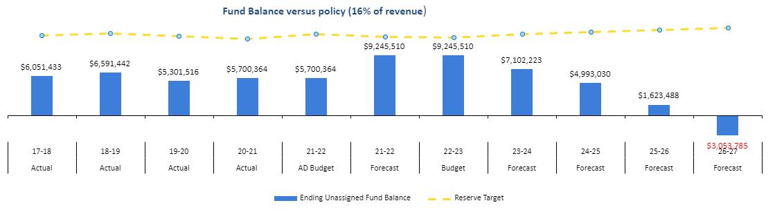 City Council Resolution 17-729 adopts a policy that the City will endeavor to maintain a minimum Unrestricted and Unassigned Fund Balance in the General Fund equal to 16% of annual operating revenues. Through the leadership of the City Council and strong financial management by City staff, the Unrestricted Fund Balance for the General Fund is projected to rise to 12% of budgeted expenditures in the 2022-23 Fiscal Year. While this is a significant improvement to the City’s overall financial position, the increase is not structural in nature as it reflects savings primarily from personnel vacancies and onetime intergovernmental revenue. This is also the final year of a pandemic grant subsidy for transit operations. Sustaining this service will require an additional $1.2M in general fund expenditures beginning in FY 23-24.