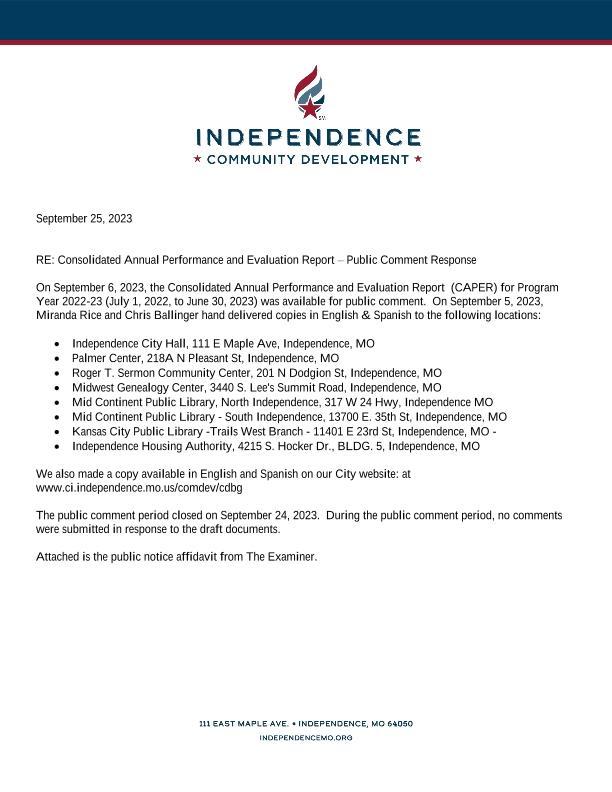 The public comment period for the 2022-23 CAPER will begin September 6, 2023, with a legal advertisement in the Independence Examiner and will be concluded September 24, 2023. The public will be encouraged to give comments regarding the CDBG program as a whole and the CAPER for 2022-23. All proposed actions under the Entitlement Program were reviewed for compliance under HUD regulations, specifically that they meet a national objective, constitute an eligible activity, and address one of the goals established by the City within its Consolidated Plan.