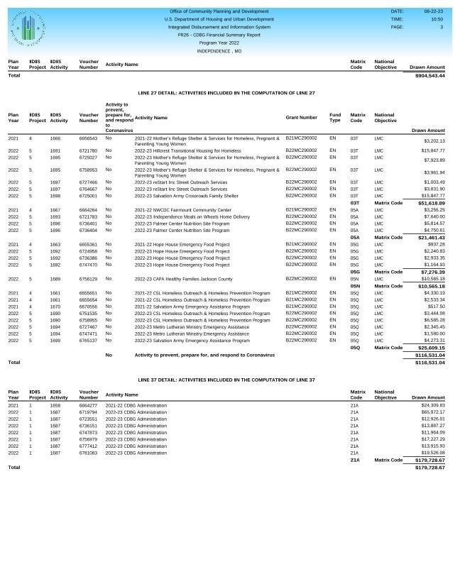 The public service activities and Program administration were basis for allocating 2022-23 CDBG and HOME Program investments within the boundaries of Independence, was determined primarily by the results (identification of needs and priorities) of the annual citizen participation process, and through committee evaluation of competitive grant applications submitted by eligible sub-recipients and thirdparty developers. Fifteen percent (15%) of CDBG funds (Public Services) and HOME funds (excluding the