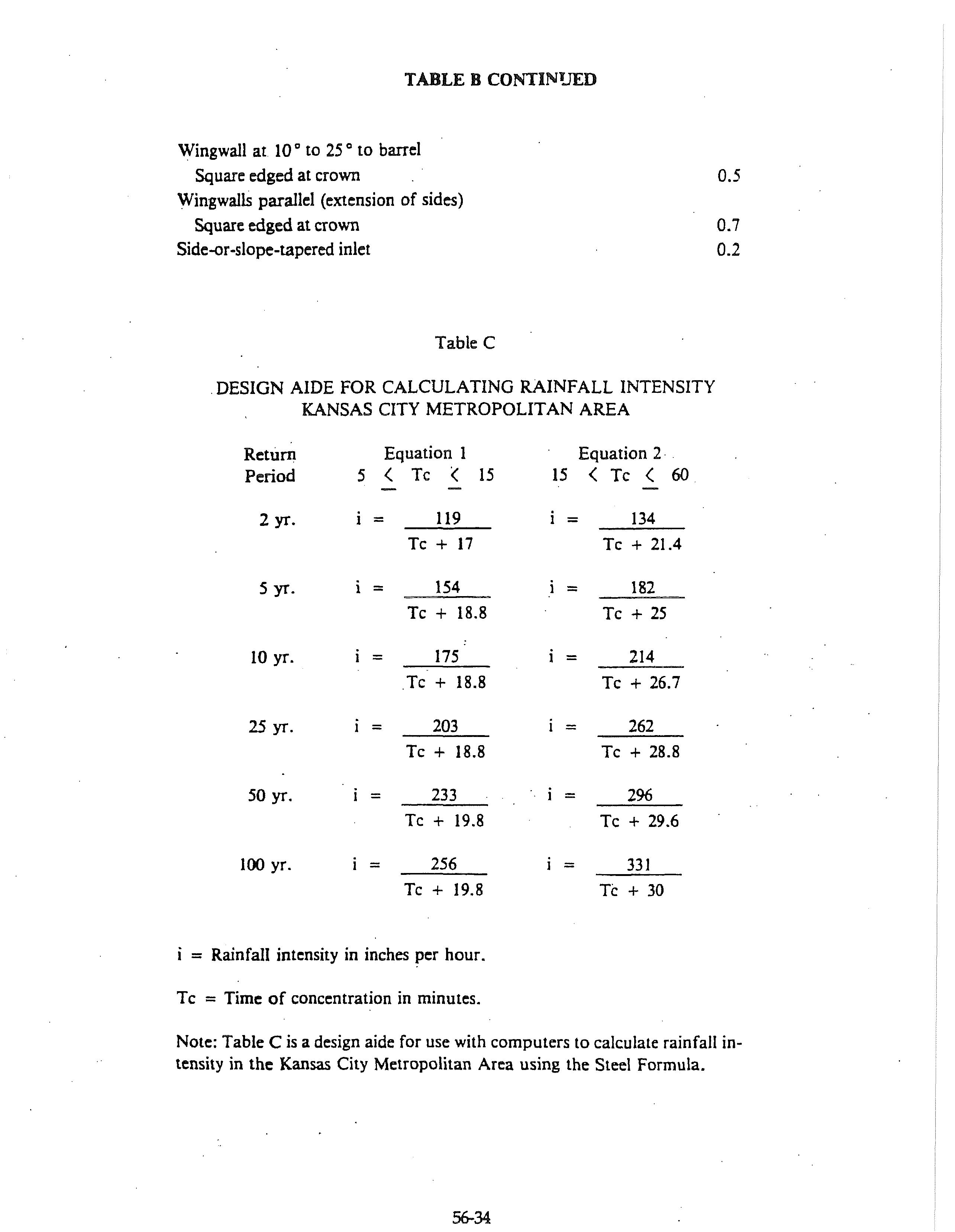 Note: Table C is a design aide for use with computers to calculate rainfall intensity in the Kansas City Metropolitan Area using the Steel Formula.