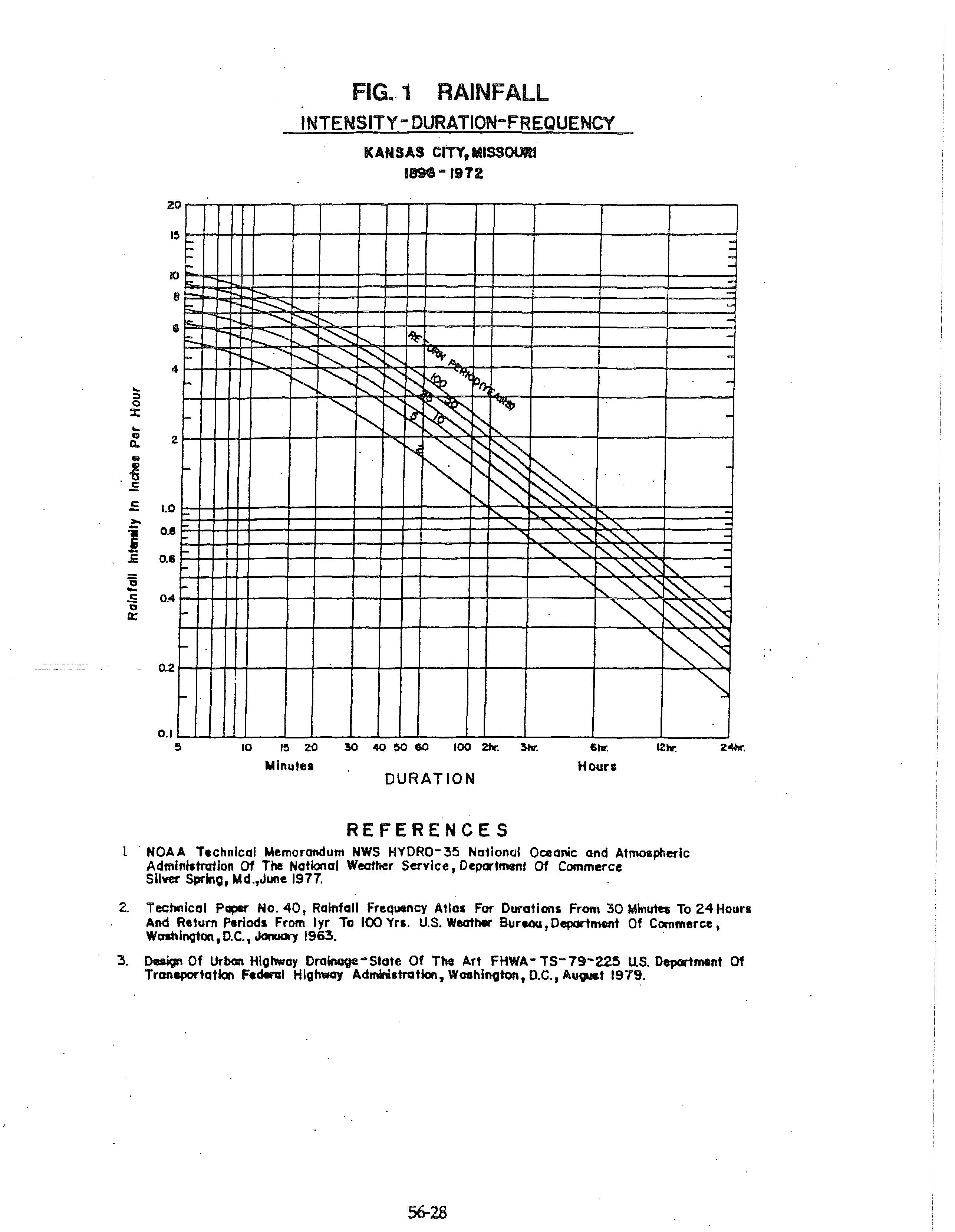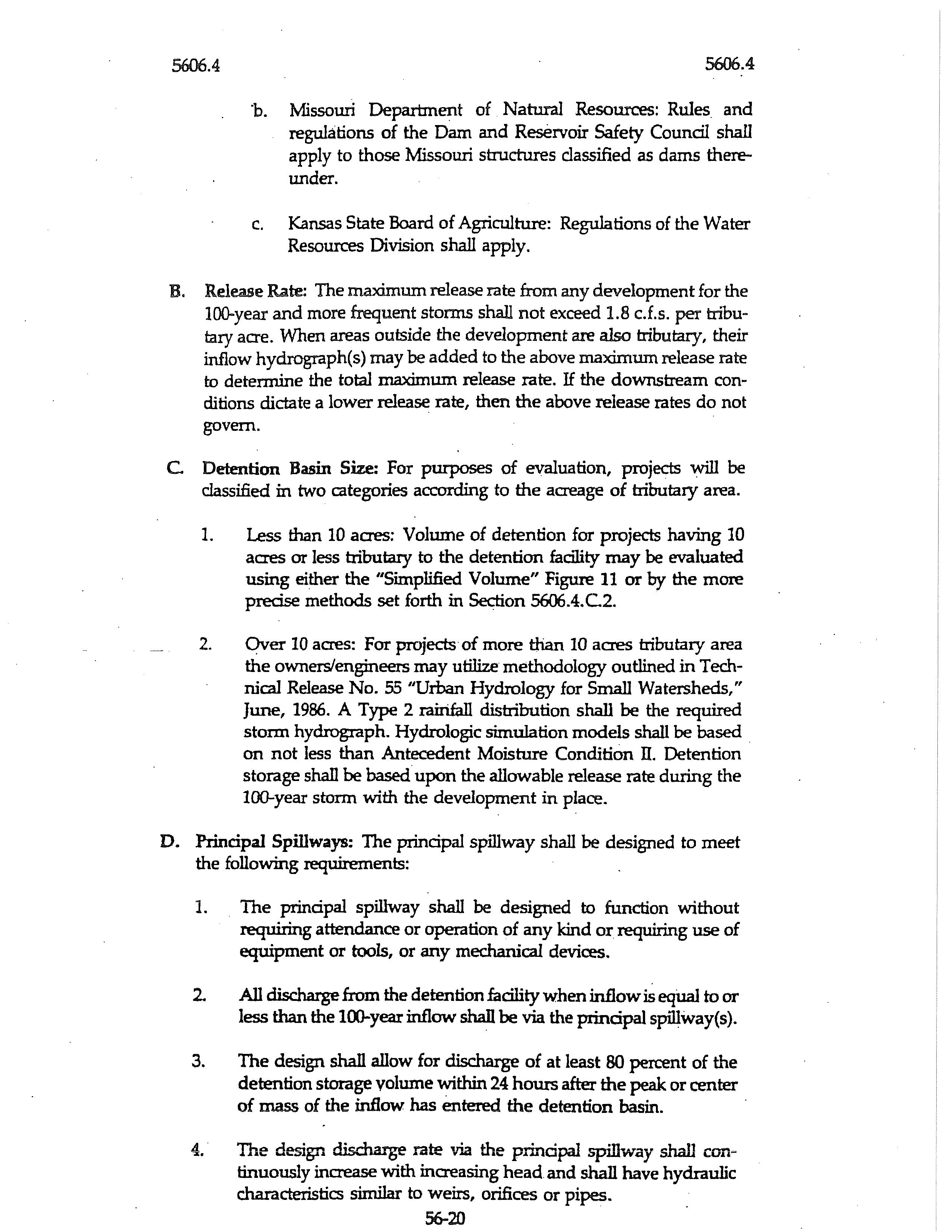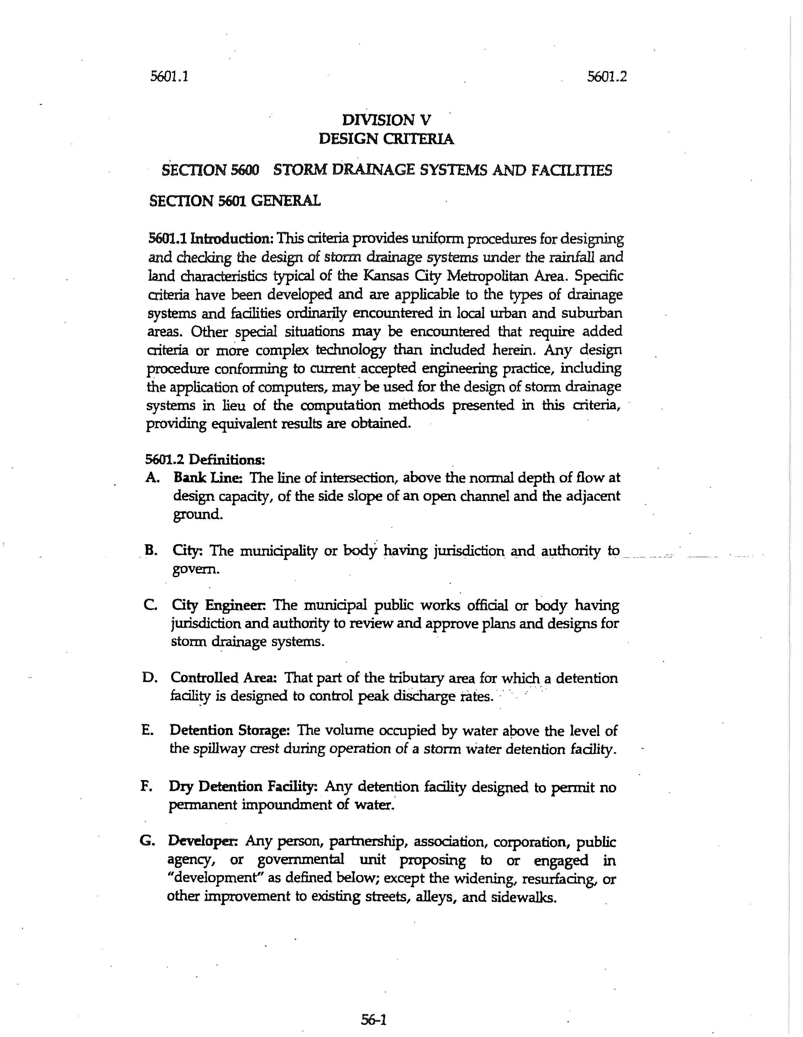 5601.1 Introduction: This criteria provides uniform procedures for designing and checking the design of storm drainage systems under the rainfall and land characteristics typical of the Kansas Gty Metropolitan Area. Specific criteria have been developed and are applicable to the types of drainage systems and facilities ordinarily encountered in local urban and subwban areas. Other special situations may be encountered that require added criteria or more complex technology than included herein. Any design procedure conforming to current. accepted engineering practice, including the application of computers, may be used for the design of storm drainage systems in lieu of the computation methods presented in this criteria, providing equivalent results are obtained.