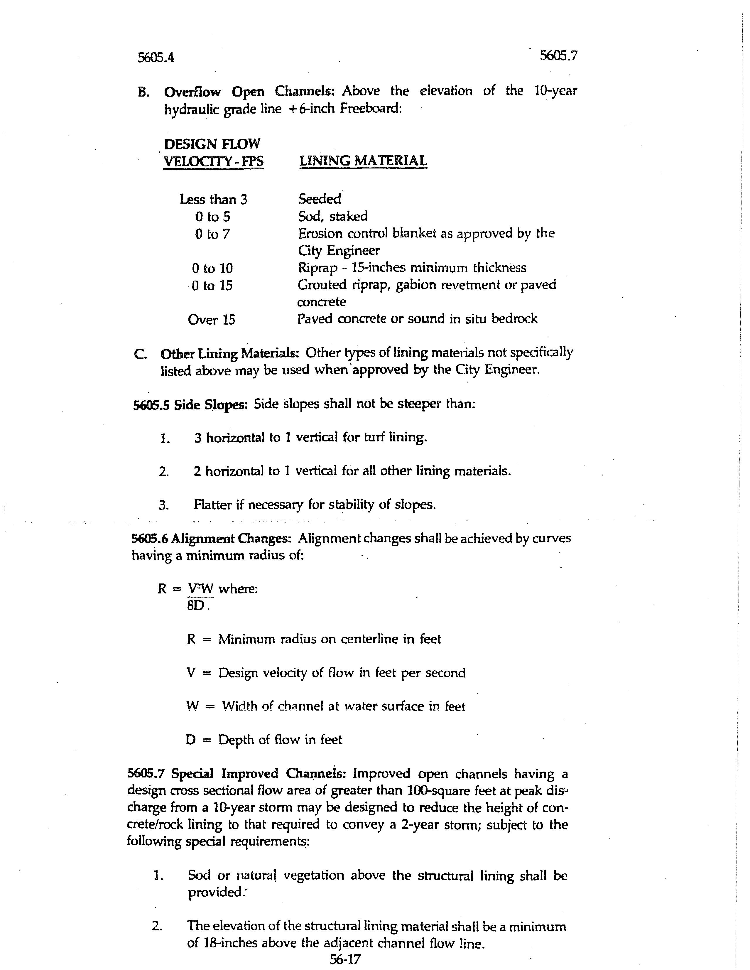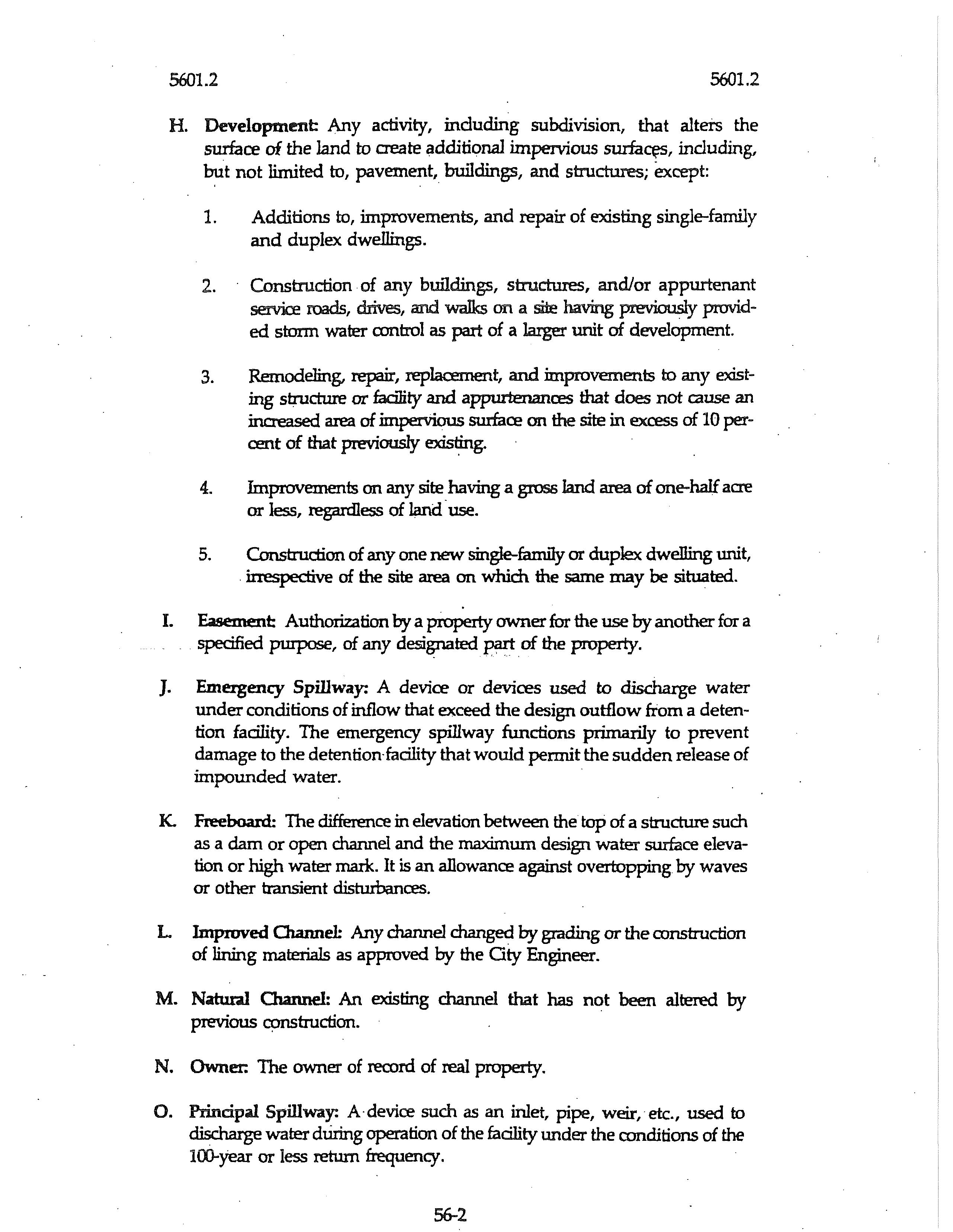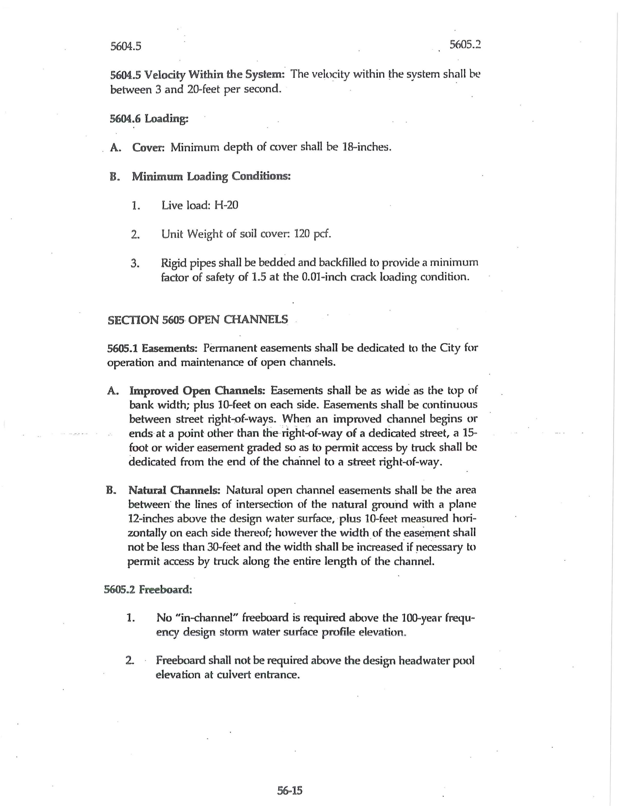 5601.1 Introduction: This criteria provides uniform procedures for designing and checking the design of storm drainage systems under the rainfall and land characteristics typical of the Kansas Gty Metropolitan Area. Specific criteria have been developed and are applicable to the types of drainage systems and facilities ordinarily encountered in local urban and subwban areas. Other special situations may be encountered that require added criteria or more complex technology than included herein. Any design procedure conforming to current. accepted engineering practice, including the application of computers, may be used for the design of storm drainage systems in lieu of the computation methods presented in this criteria, providing equivalent results are obtained.