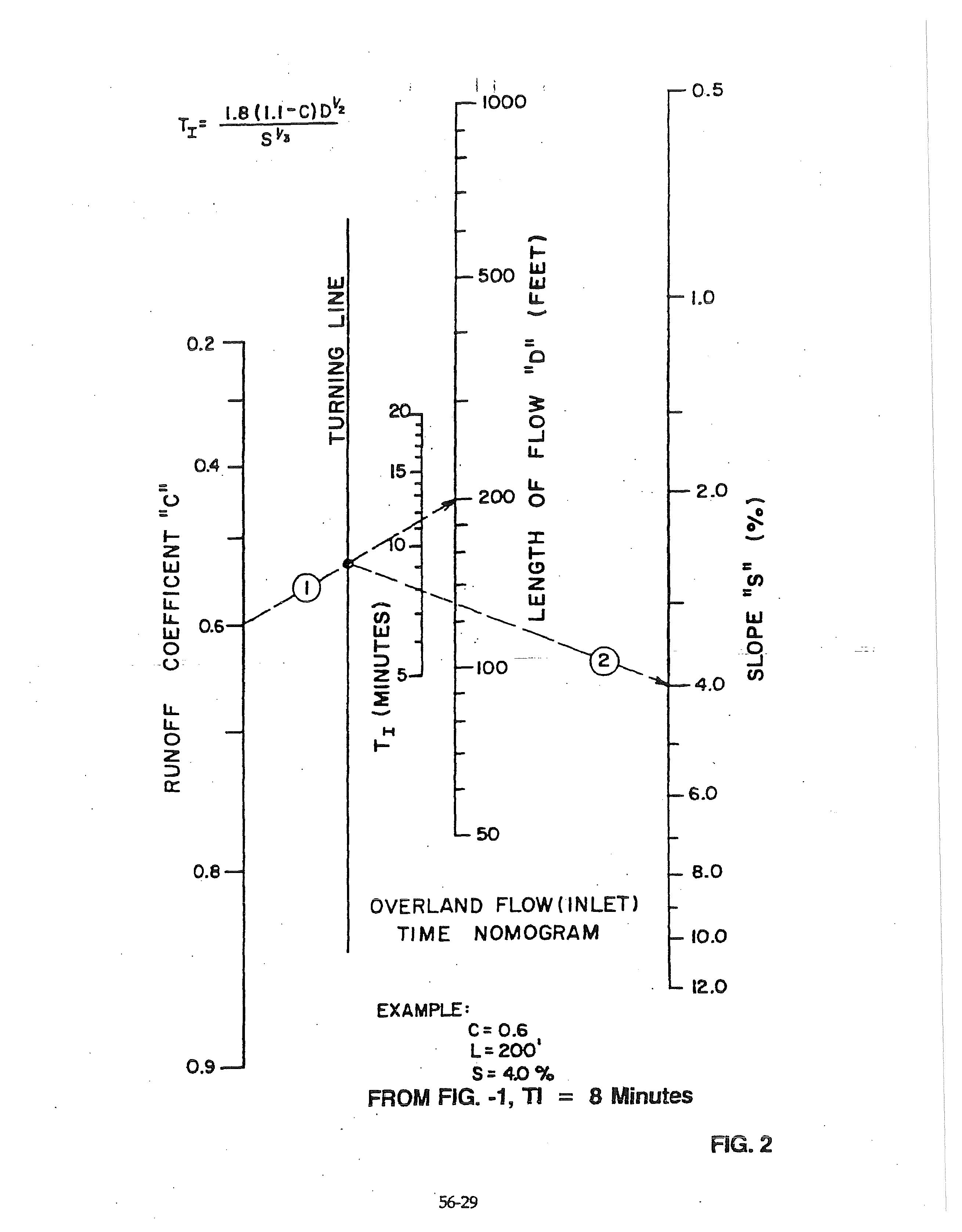 5602.5 Rainfall Intensity: Rainfall intensity shall be determined from Figure 1 or Table C using a Calculated Time of Concentration, TC· Tc is equal to the overland flow time to the most upstream inlet or other point of entry to the system, Inlet Time, Ti plus the time for flow in the system to travel to the point under consideration Travel Time, Ty. (Tc = TJ .+ Ty).