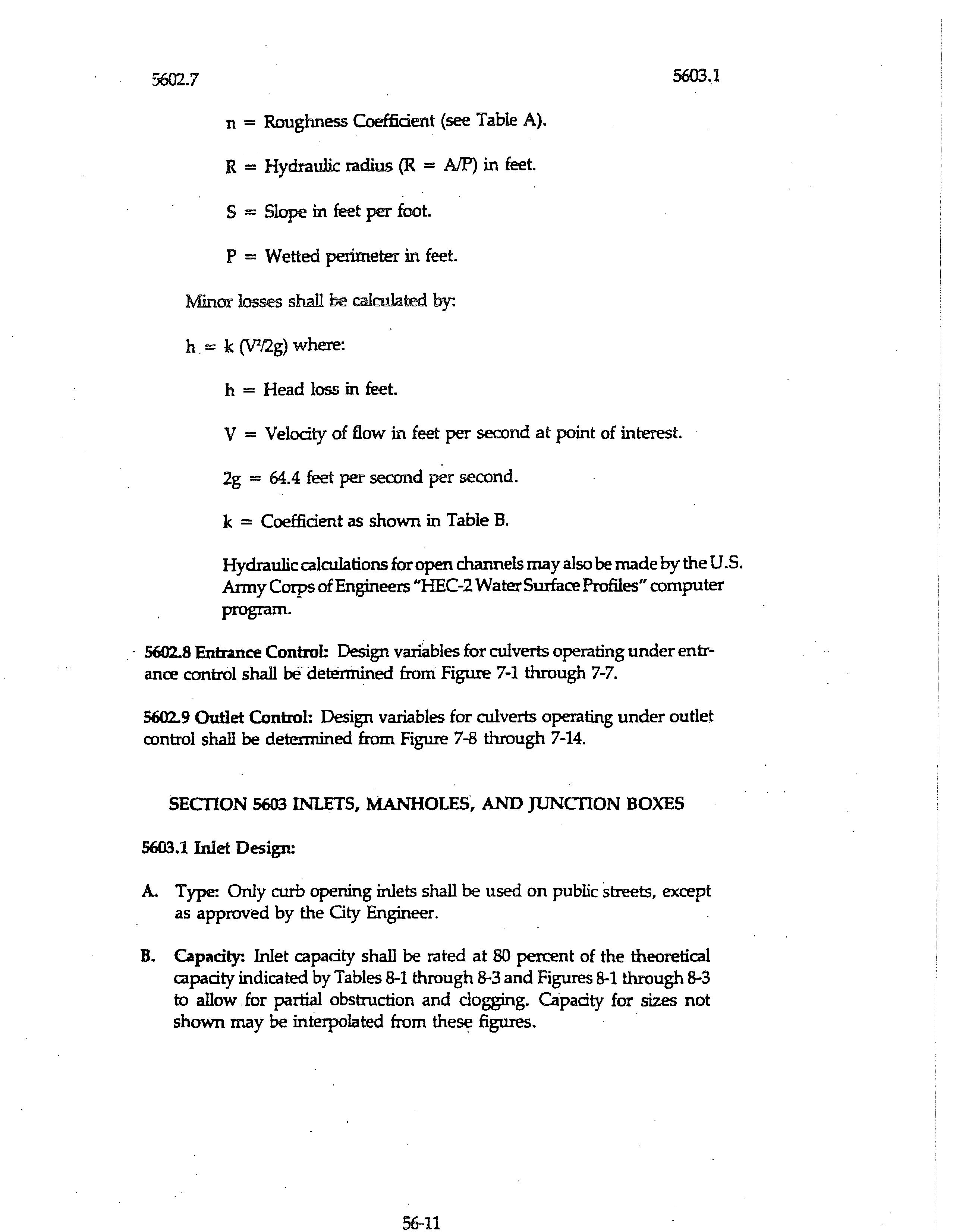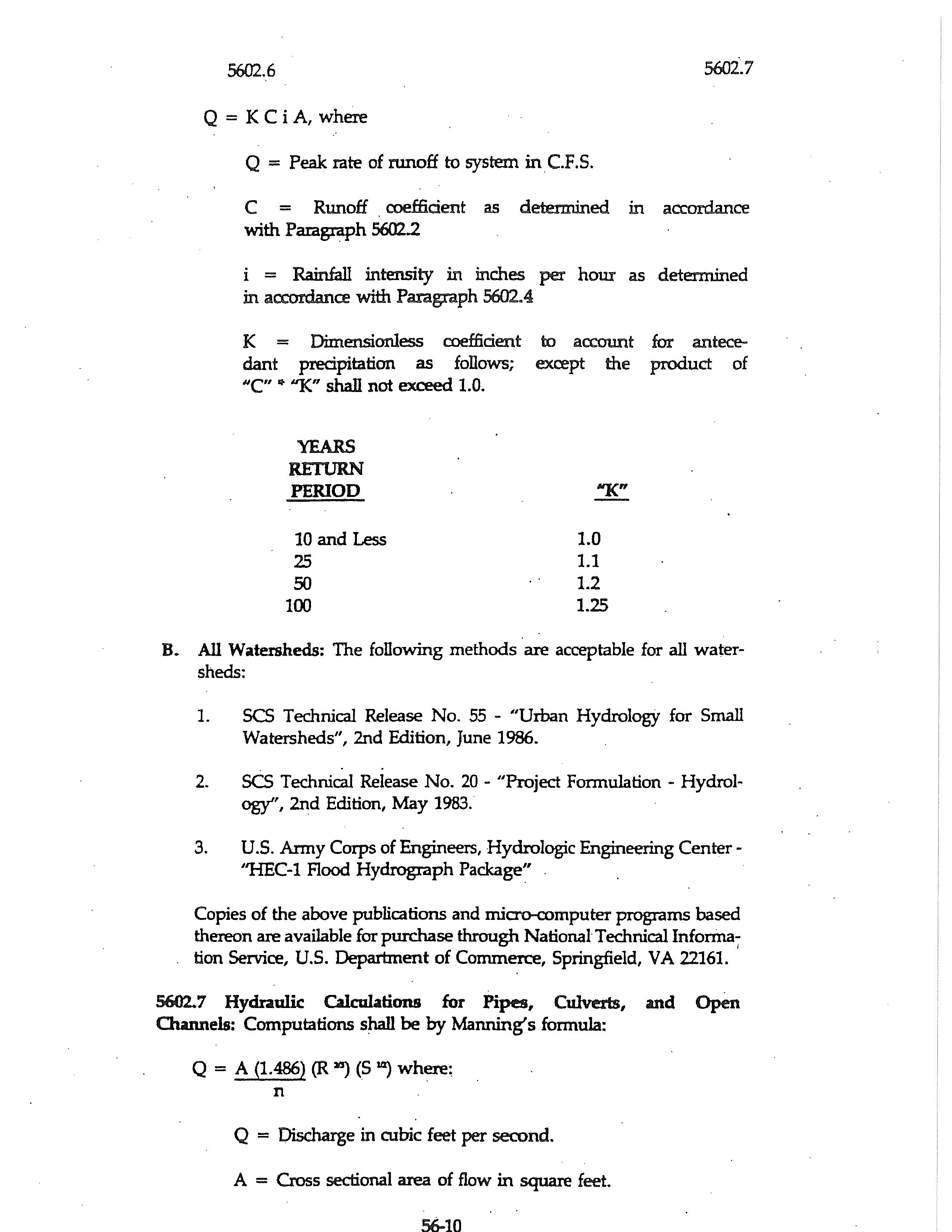 5602.6 Computation Methods for Runoff: Runoff rates to be accommodated by each element of the proposed ·storm drainage system shall be calculated using the foregoing criteria for land use runoff factors, rainfall, and · system time. The following alternative computation methods are acceptable. Other methods, including computer models may be employed so long as they produce calculated runoff to the system that is substantially the sam e as that calculated by the foregoing criteria: