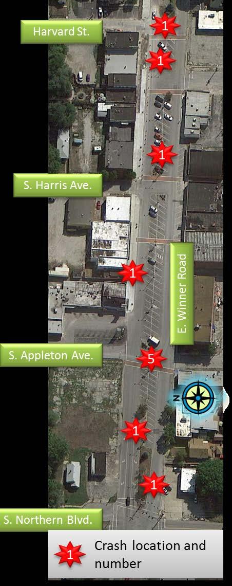 As part of this section, the crash rates and the predominant causes of crashes on E. Winner Road are examined. The high crash location is at Appleton Avenue and the main cause of the crashes is a lack of sight distance for traffic turning onto Appleton Avenue from E. Winner Road. When cars are parked in the median parking spots, the sight triangle is penetrated and turning vehicles are unable to see approaching traffic.