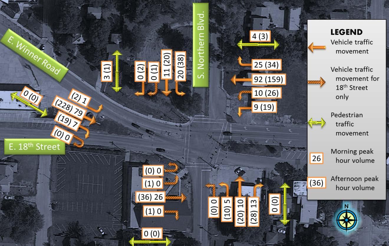 This phase was primarily completed during the charrette on August 5 and 6, 2013. The steering committee and the Transportation Focus Group were presented with the existing conditions. During the discussions, it was noted that the E. 18th Street leg of the intersection was primarily funneling traffic to and from E. Winner Road. Good connectivity within the network allows traffic to turn onto E. 18th Street from S. Ralston Avenue to the west and E. 19th Street to the south.
