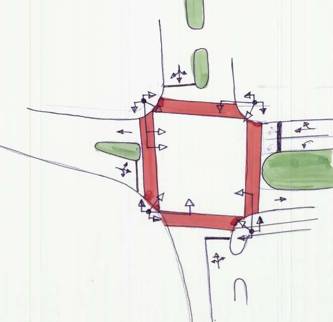 Using the four-legged intersection as a basis, two alternatives for traffic control are evaluated and discussed in the charrette. A capacity analysis for both alternatives reveals that the intersection would operate with no delays regardless of the intersection control. However, charrette participants overwhelmingly approved the roundabout concept because of the inherent safety features.