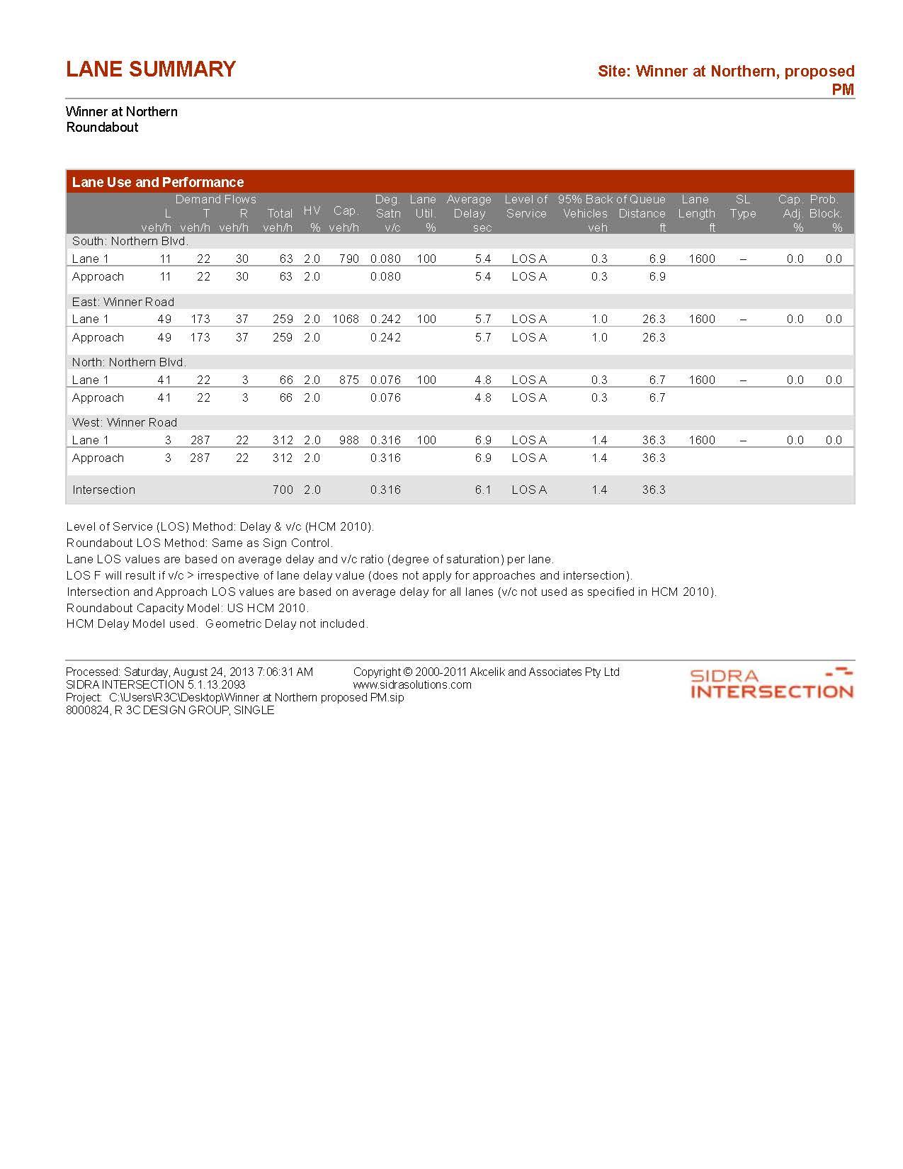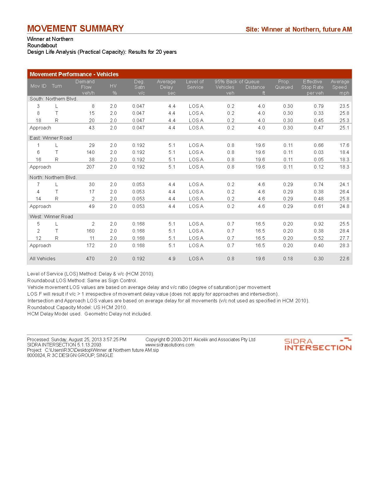 memo Page 12 of 27 18 th Street removed Capacity Analysis results Signal intersection Existing traffic counts Peak hour/ item Approach Intersection Winner Rd. Westbound Northern Northbound Northern Southbound Winner Rd. Eastbound Morning Delay * 13.4 4.2 4.3 15.2 12.3 LOS B A A B B Afternoon Delay * 12.7 7.4 7.4 14.8 12.7 LOS B A A B B 18 th Street removed Capacity Analysis results Roundabout intersection Existing traffic counts Peak hour/ item Approach Intersection Winner Rd. Westbound Northern Northbound Northern Southbound Winner Rd. Eastbound Morning Delay * 4.5 4.0 4.0 4.5 4.4 LOS A A A A A Afternoon Delay * 5.7 5.4 4.8 6.9 6.1 LOS A A A A A