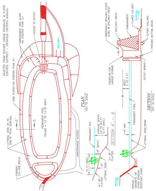 The basin design must be designed ,signed and sealed by professional engineer registered in the state of Missouri. Excavate basin to length, width, depth and slopes specified on plans. Place and compact fill to construct dam to elevation at least 1 foot above crown of outlet pipe. Install outlet pipe and compact clayey soil around pipe. Install the perforated riser pipe, wrap with fabric, and surround with uniformly graded gravel. Install BMP at downstream end of outlet pipe. Grade and stabilize spillway. Install monitoring post near outlet of basin. Mark maximum allowable sediment depth.