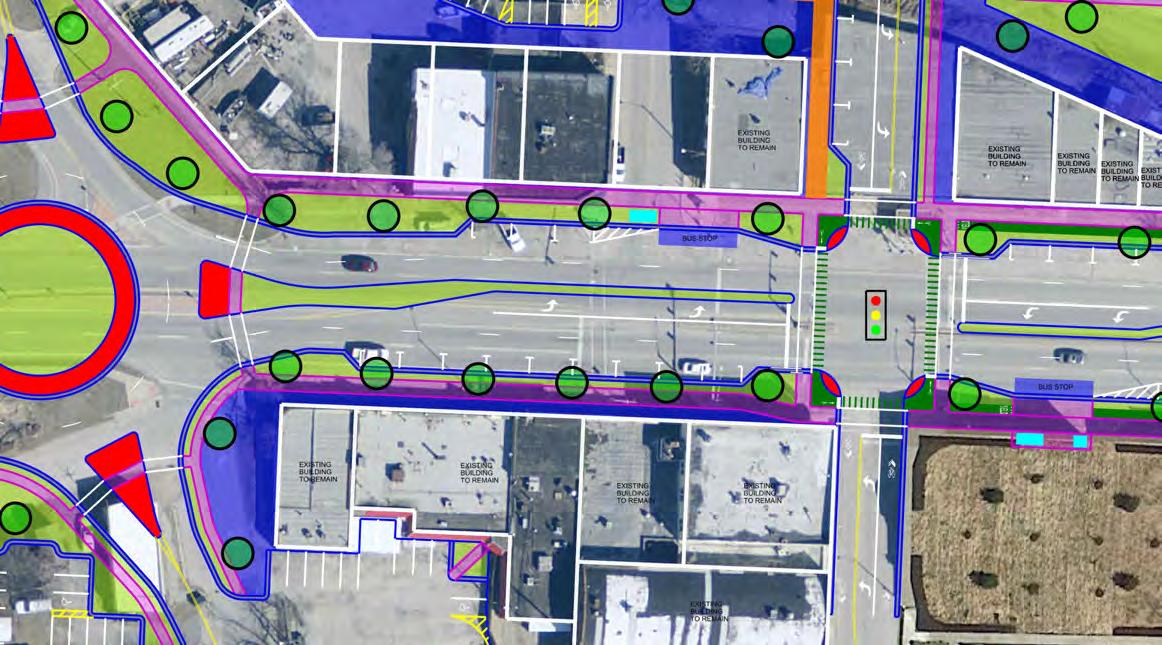 Implementation of road re-alignment, reduced lane widths, landscaped median, on-street parallel parking and wide pedestrian zones. Improvements could include vertical elements such as street trees and lighting to add more color and cultural aesthetic to the corridor.