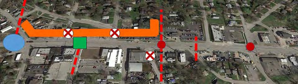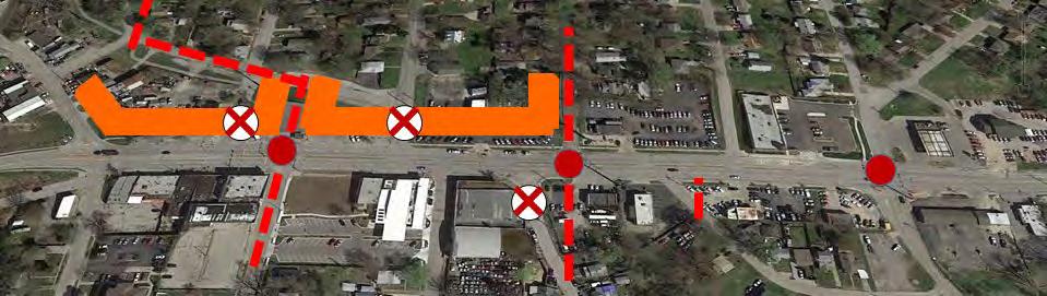 S Huttig Ave should be removed for one block to the north of US-24. This will allow for the reconstruction of a single traffic signaled intersection with protected bicycle facilities connecting bicycle movement from the north to south of US-24. Acquisition of the property north of S Ash should be considered or working with a developer to redevelop this important intersection.