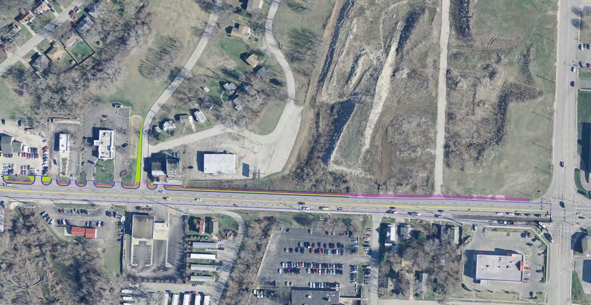 The 1 block segment from E Wilson Road to S Huttig Ave has the tightest distance between the existing building facades along the north and south sides of US-24 at about 107 feet. The buildings on the north side are in poor condition. Should the two buildings need to be demolished, the new building facades should match the buildings east of S Huttig Ave (at about 118 feet from building façade to building façade).