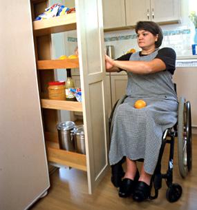 Generally, accessible kitchens are designed for the primary kitchen user, who is seated. A seated user may have limited reach range, which will restrict the usefulness of wall cabinets and will create an immediate need for storage between 18" to 48" high. A person who uses a wheelchair will need more maneuvering room in the kitchen and carefully located knee space under counters.