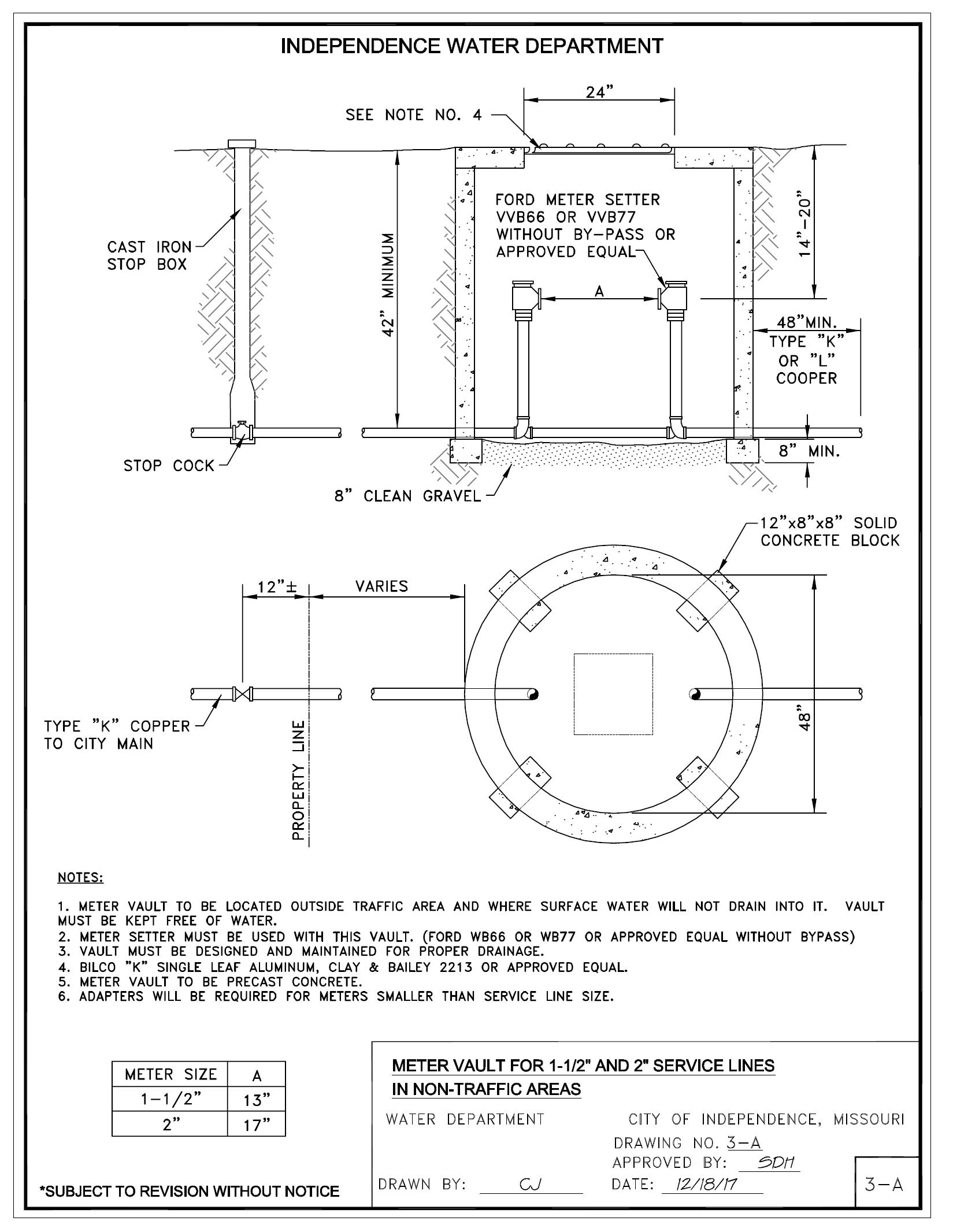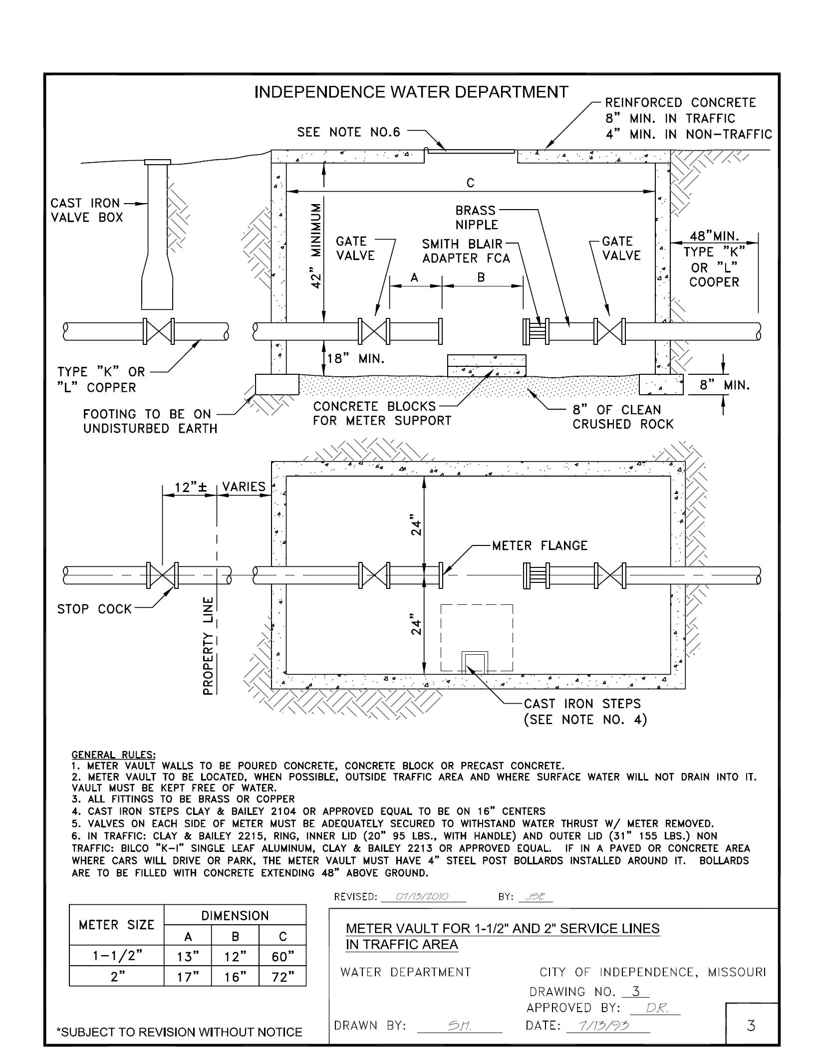 General Index (Cont.) General Description Page No. EXHIBIT “A” Tap Hole Dimensions for ¾” thru 2” Service Connections EXA EXHIBIT “A-1” Polywrap Installation for Service Line EX A-1 EXHIBIT “B” Tap Hole Dimensions for Large Tap Holes 3” and Larger Service Connections EXB DRAWING 1 Typical Water Cross-Section – Domestic Water Service Line 1 DRAWING 2 Meter Box for ¾”, 1” and 1-1/4” Service Lines 2 DRAWING 2A Ford Meter Yoke for ¾”, 1” and 1-1/4” Service Lines 2-A DRAWING 3 Meter Vault for 1-1/2” and 2” Service Lines in Traffic Areas 3 DRAWING 3A Meter Vault for 1-1/2” and 2” Service Lines in Non-Traffic Areas 3-A DRAWING 4 Meter Vault for 3”, 4” and 6” Service Lines 4 & 4-2 DRAWNING 5 & DRAWNING 5-A Meter Vault for Split Service Lines 5 & 5-2 DRAWING 5A & DRAWNING 5A2 Meter Vault for Split Service with Fire Department Connection 5-A & 5-A2 DRAWING 5B Installation of Fire Department Connection in a Meter Vault 5-B DRAWING 6 Meter Vault for Double Check Detector Check 6 DRAWING 6A Double Check Detector Check Inside Installation 6-A DRAWING 7 ¾” and 1” Connection for Street Crossing 7 DRAWING 8 Installation Standards and Requirements for Water Service Line – City Main Parallel to Street 8 DRAWING 9 Installation Standards and Requirements for Master Water Service Line 9 DRAWING 10 Installation Standards and Requirements for Water Service Line – Corner Lot 10 DRAWING 11 Installation Standards and Requirements for Water Service Line - City Main Not Parallel to Street 11