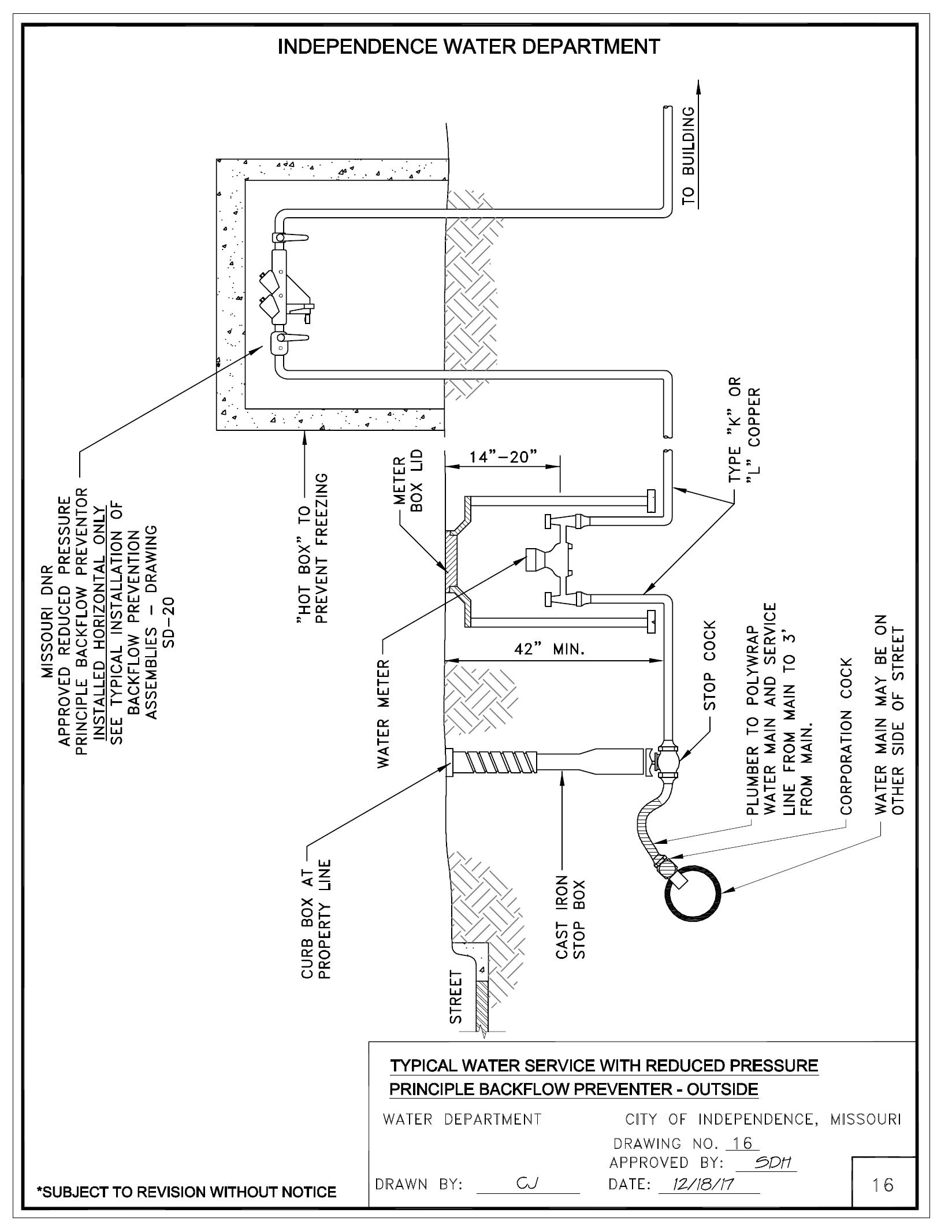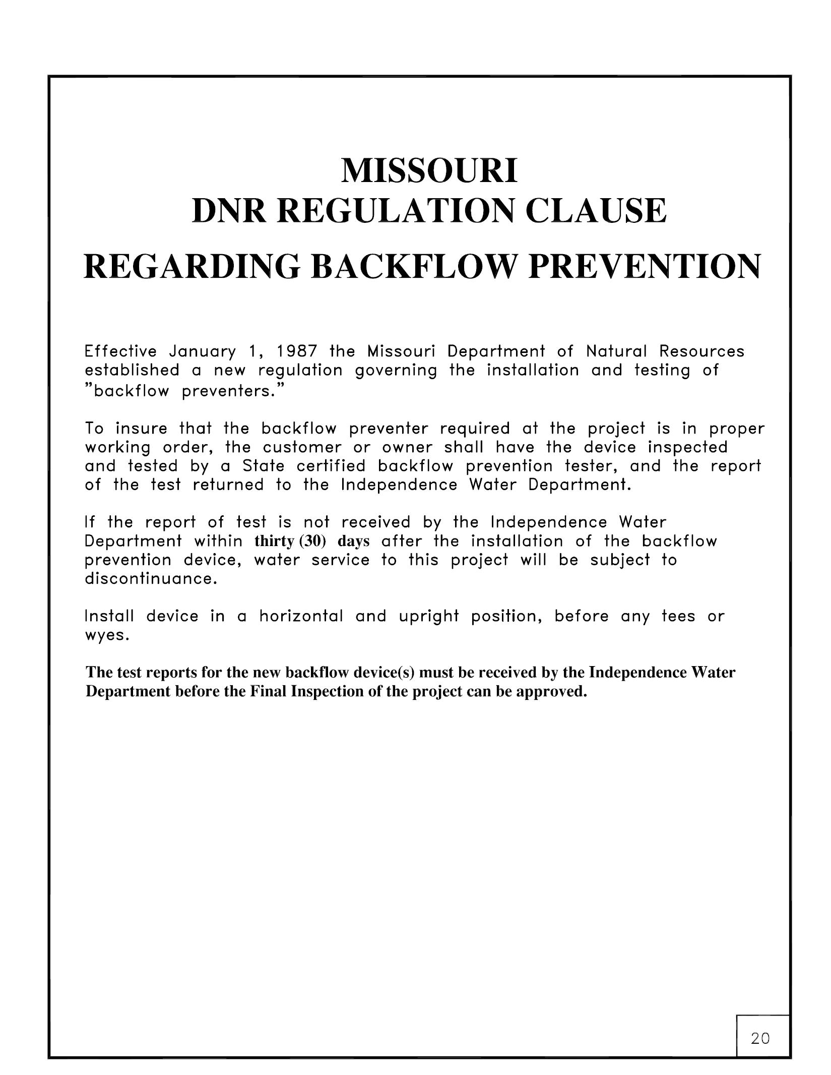 This booklet is offered to assist architects, engineers, contractors and inspectors in the planning of water service and backflow preventer installations. The City of Independence Water Department is not responsible for the design or installation of customer-owned services and backflow preventers.