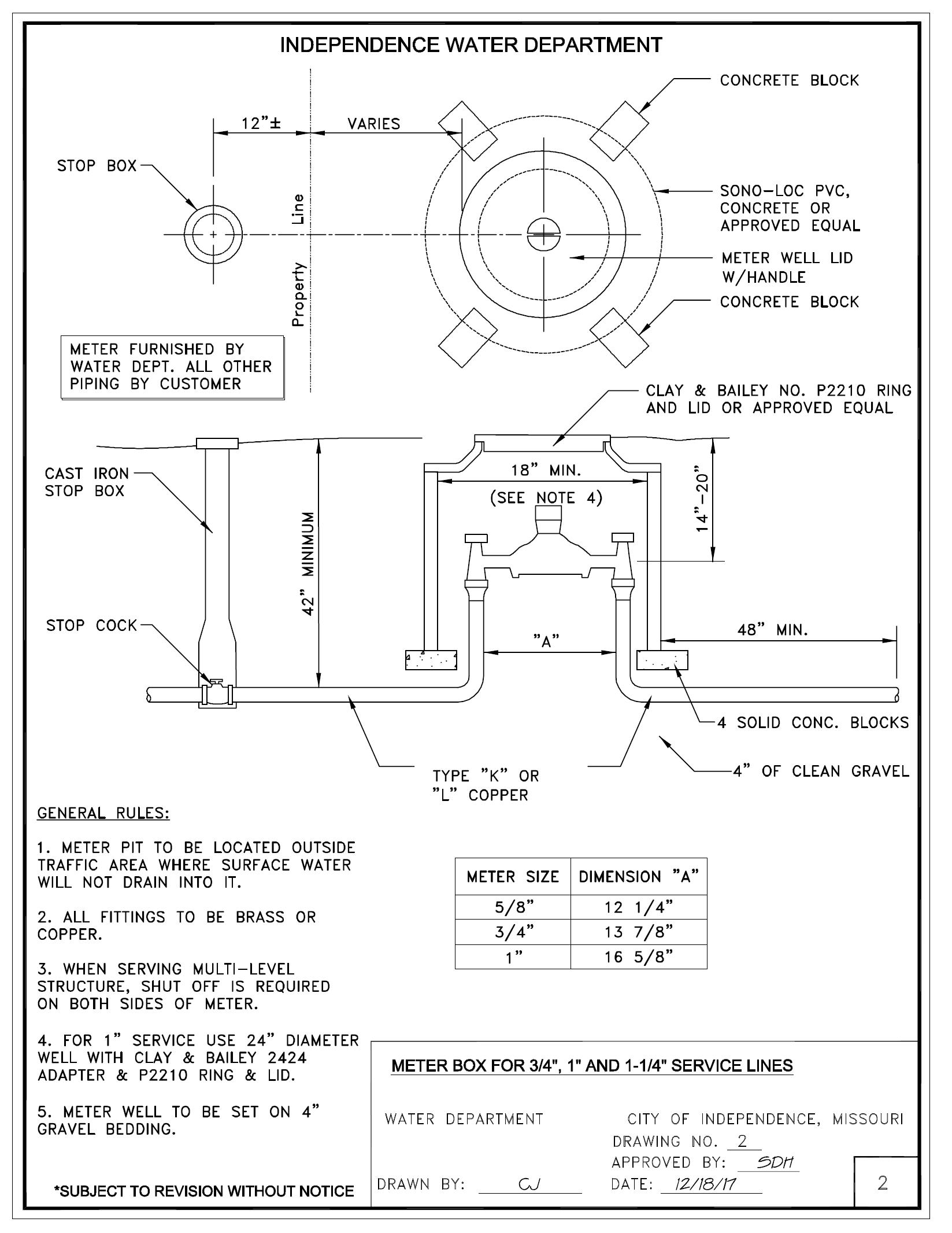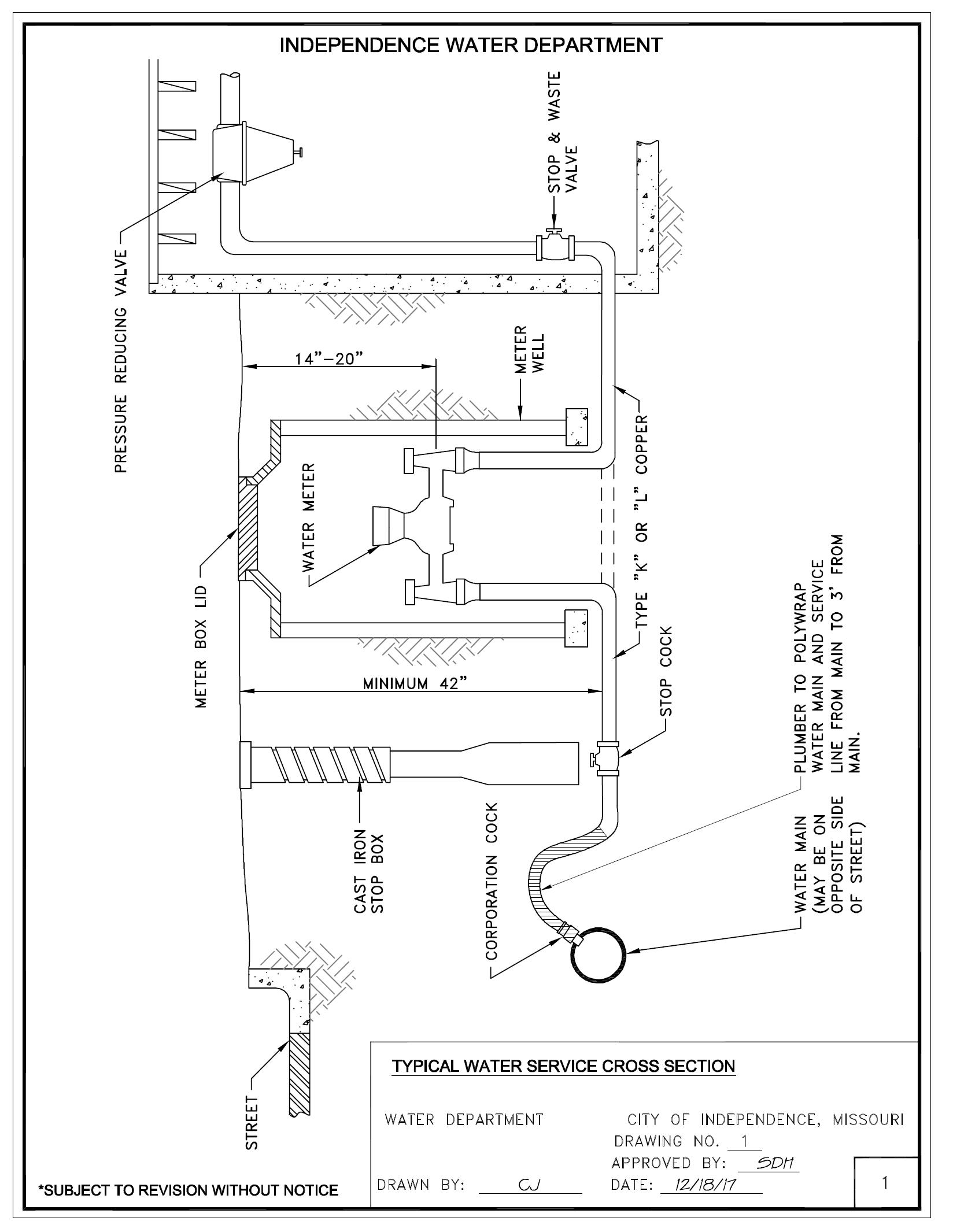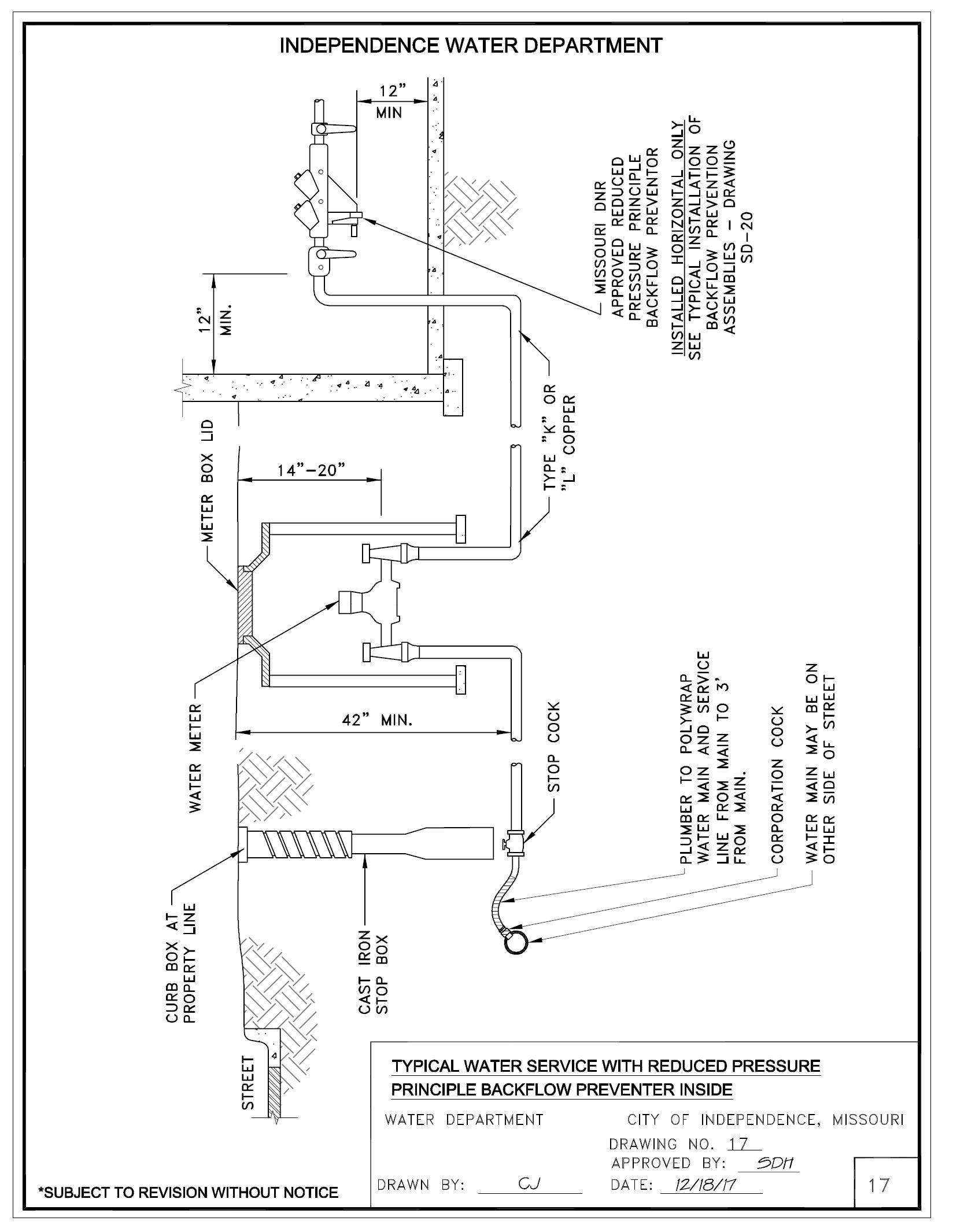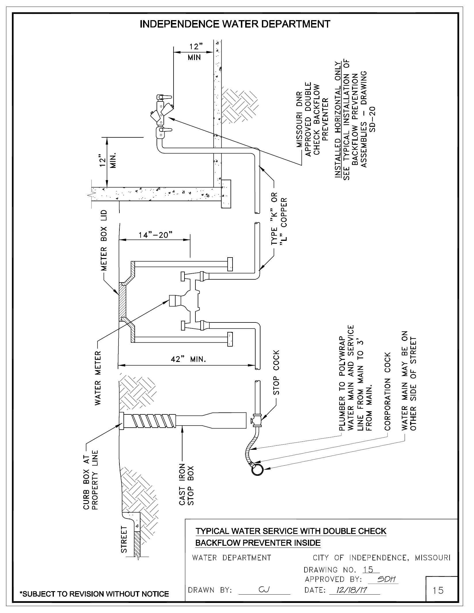 The City of Independence Water Department is dedicated to helping its customers realize optimum value from its water service. Experience has shown that uniform standards for installation are the best way to accomplish our common goals. These standards are not intended to be restrictive or burdensome, but to assist in expediting service connections and backflow installations. It is, therefore, required that customer’s service line installation and backflow comply with these standards.