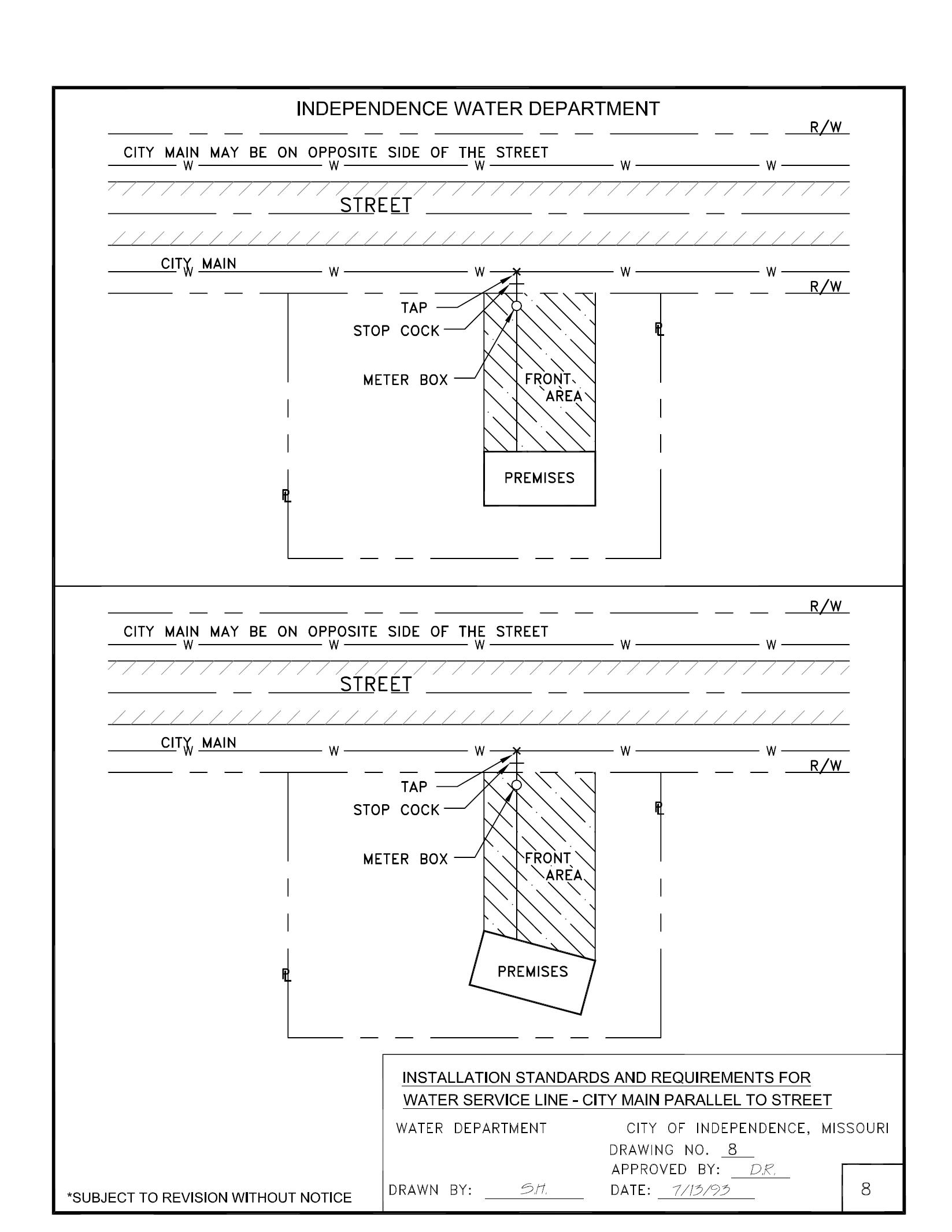 Installation standards and requirements for service lines require a separate water service line for each meter, in a straight line from the tap at the City’s main, through the “stop box” and “meter box” to the premises being served. This arrangement assures a close relationship between the service line and the premises served, and improves the ability to field locate water service line components and read the meter (see Drawing 8).