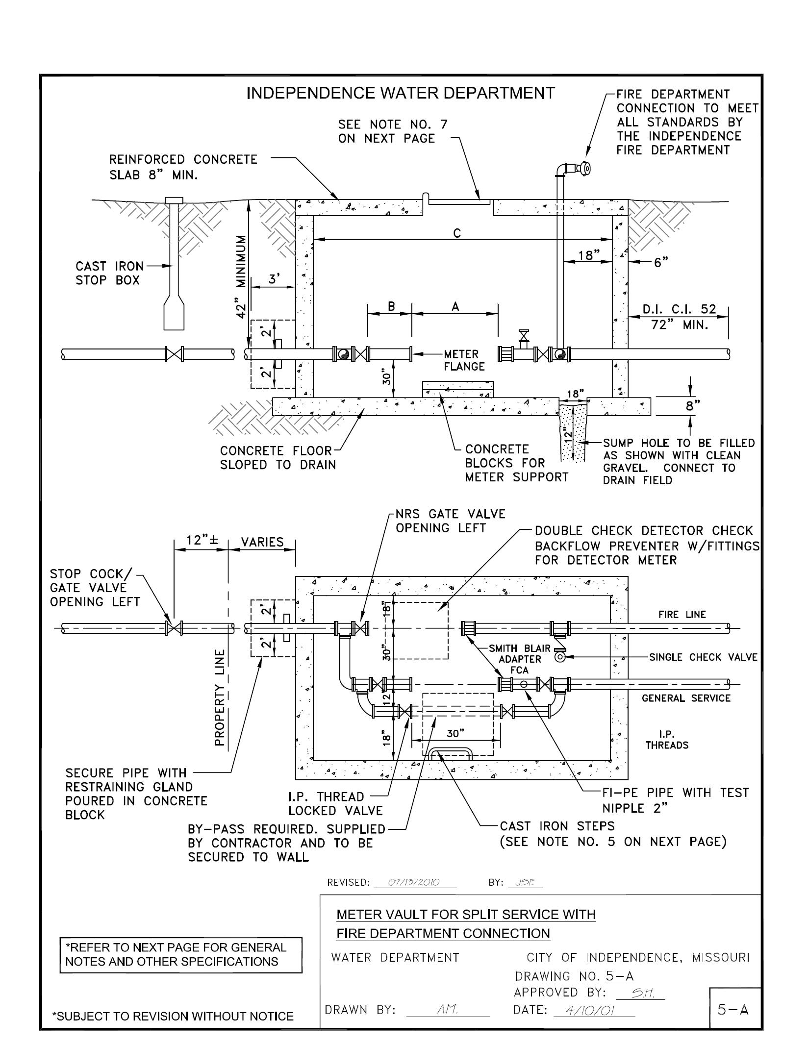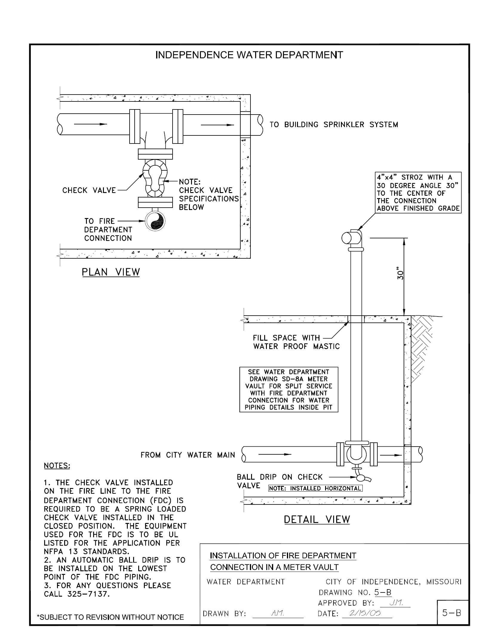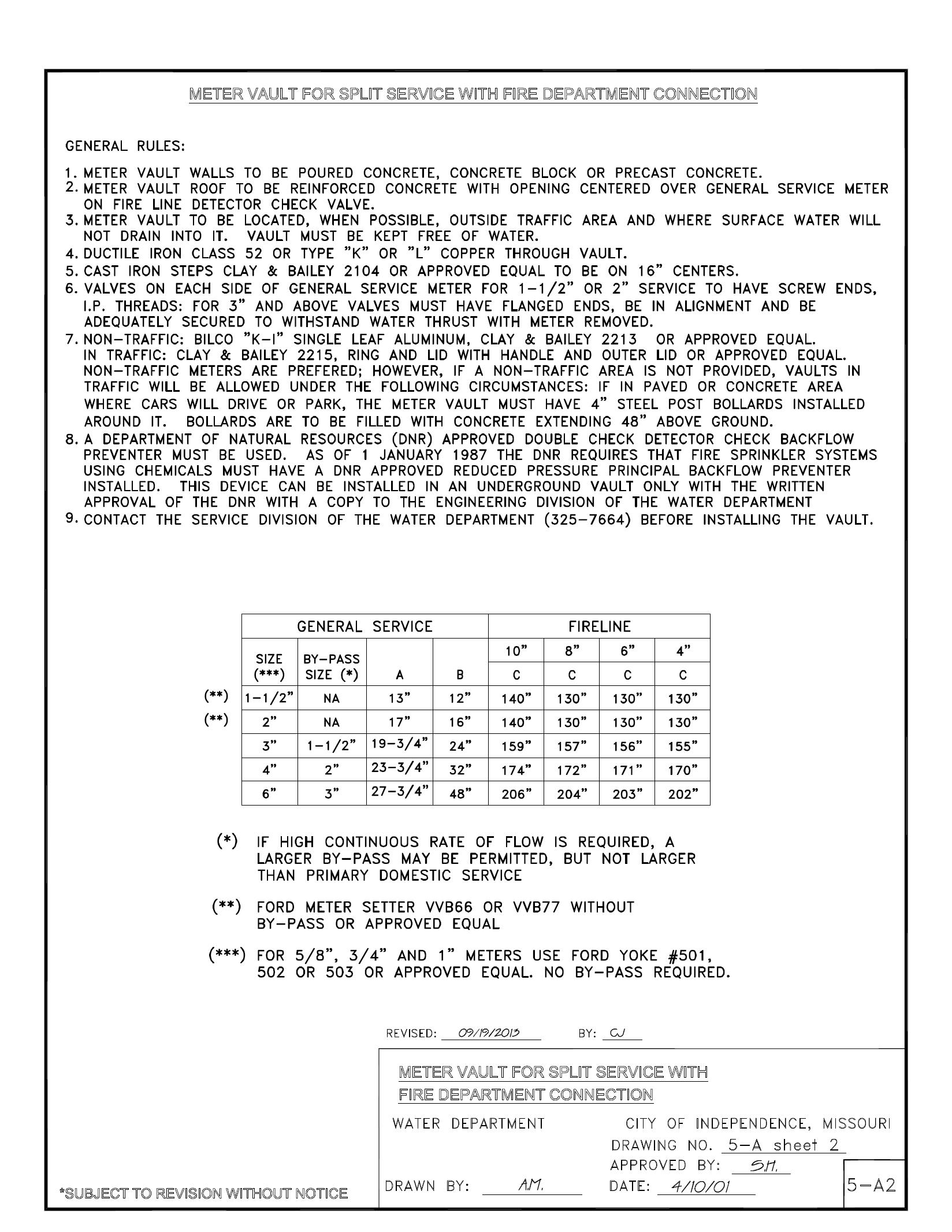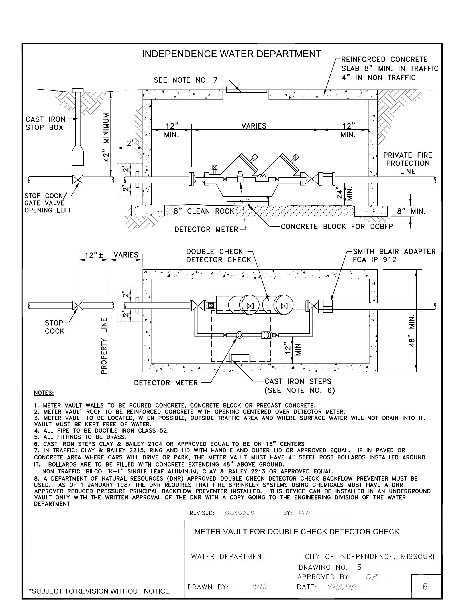 C. For water service lines having no meter box (Private Fire Protection Service Lines), materials shall be the same as described in A.2.a), A.2.b), and A.3. above, except that the copper or ductile iron pipe must extend from the City’s main to the premises served. If a detector check valve assembly is provided in the vault as part of the private fire protection service line, then: