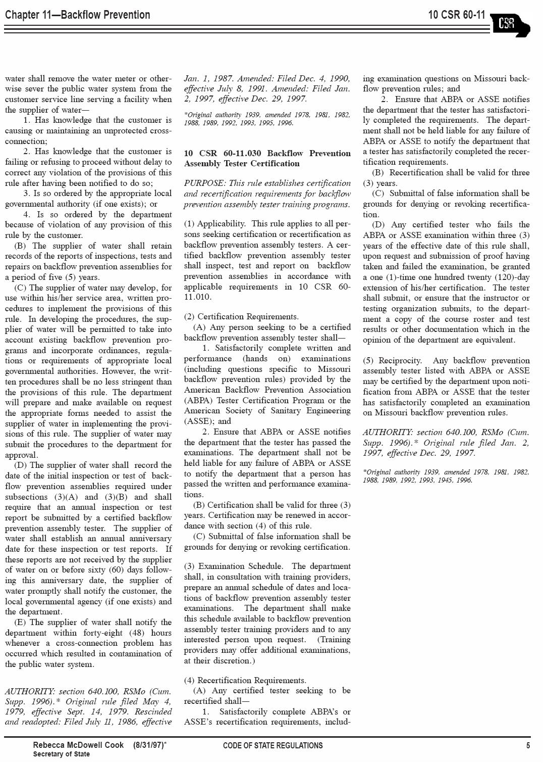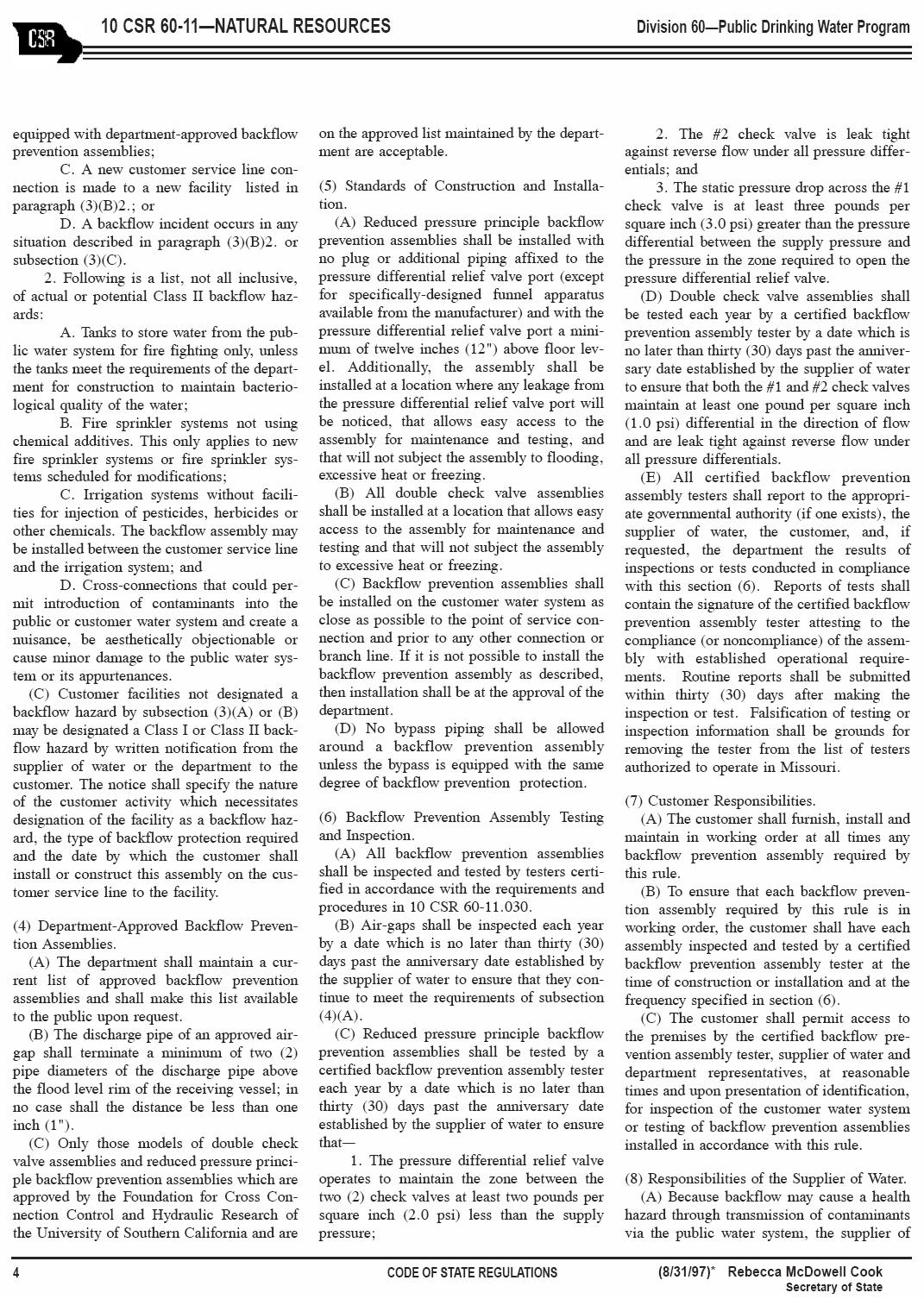 (Division 60 – Public Drinking Water Program; Chapter 11 – Backflow Prevention)