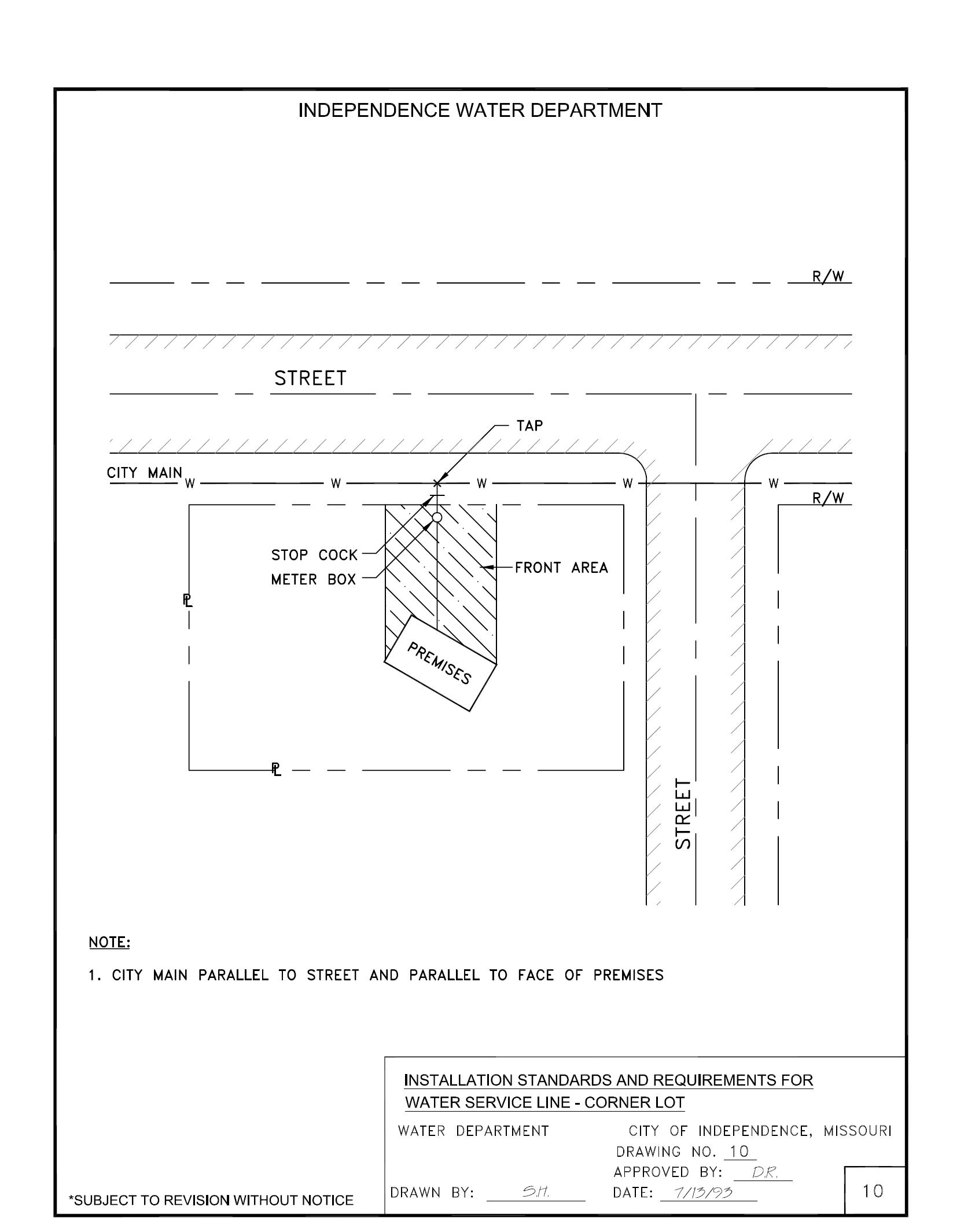 1. The “tap”, “stop cock and stop box” and “meter box” should be in a straight line perpendicular to the City’s main or master water service line and in front of the premises served (see Drawings 8, 9 and 10).