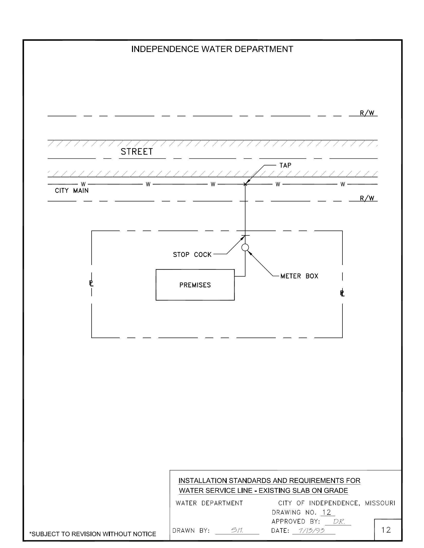 For an existing building constructed on a concrete slab foundation, the water service line may be installed at right angles to the City’s main and then be allowed to pass the building in a line parallel to the side of the building, inside the property line and as close to the building as practicable, and then turn at right angle to enter the building through the side (see Drawing 12). In case such procedure does not allow the water service line to be installed as specified herein, special instructions or variance must be obtained by the plumber or their authorized representative from the Engineering or Service Division of the Water Department.