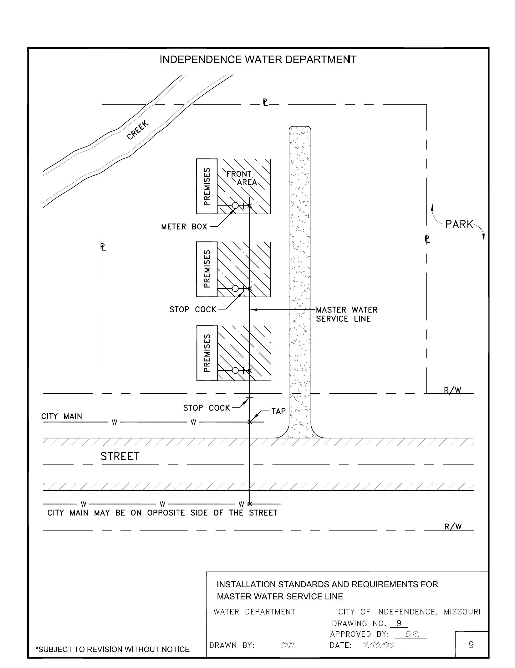 4. In addition to the control valve portion of the tap at the City’s main, a stop cock is required at or near the property line where the “Master Water Service Line” enters the parcel or property (see Drawing 9).
