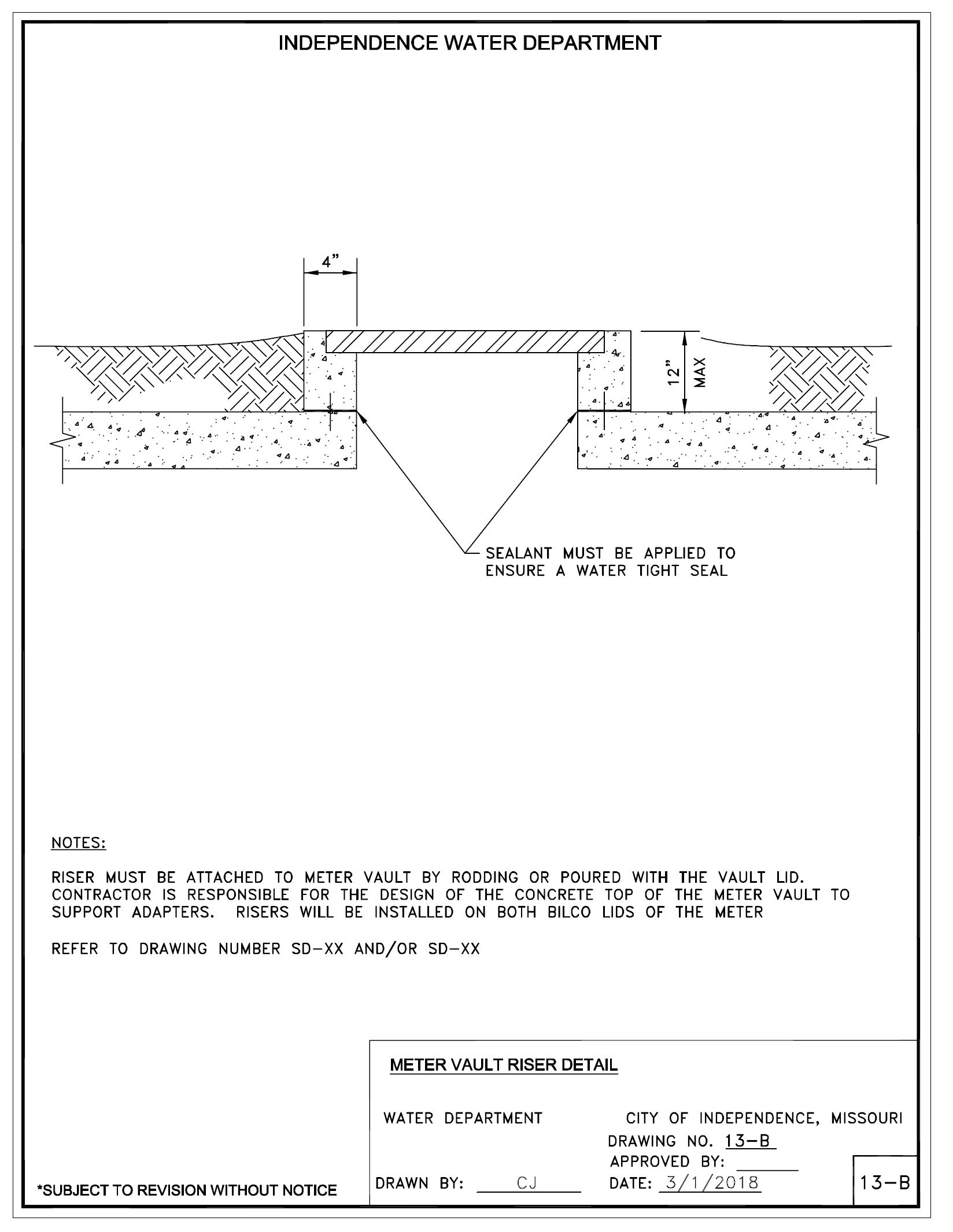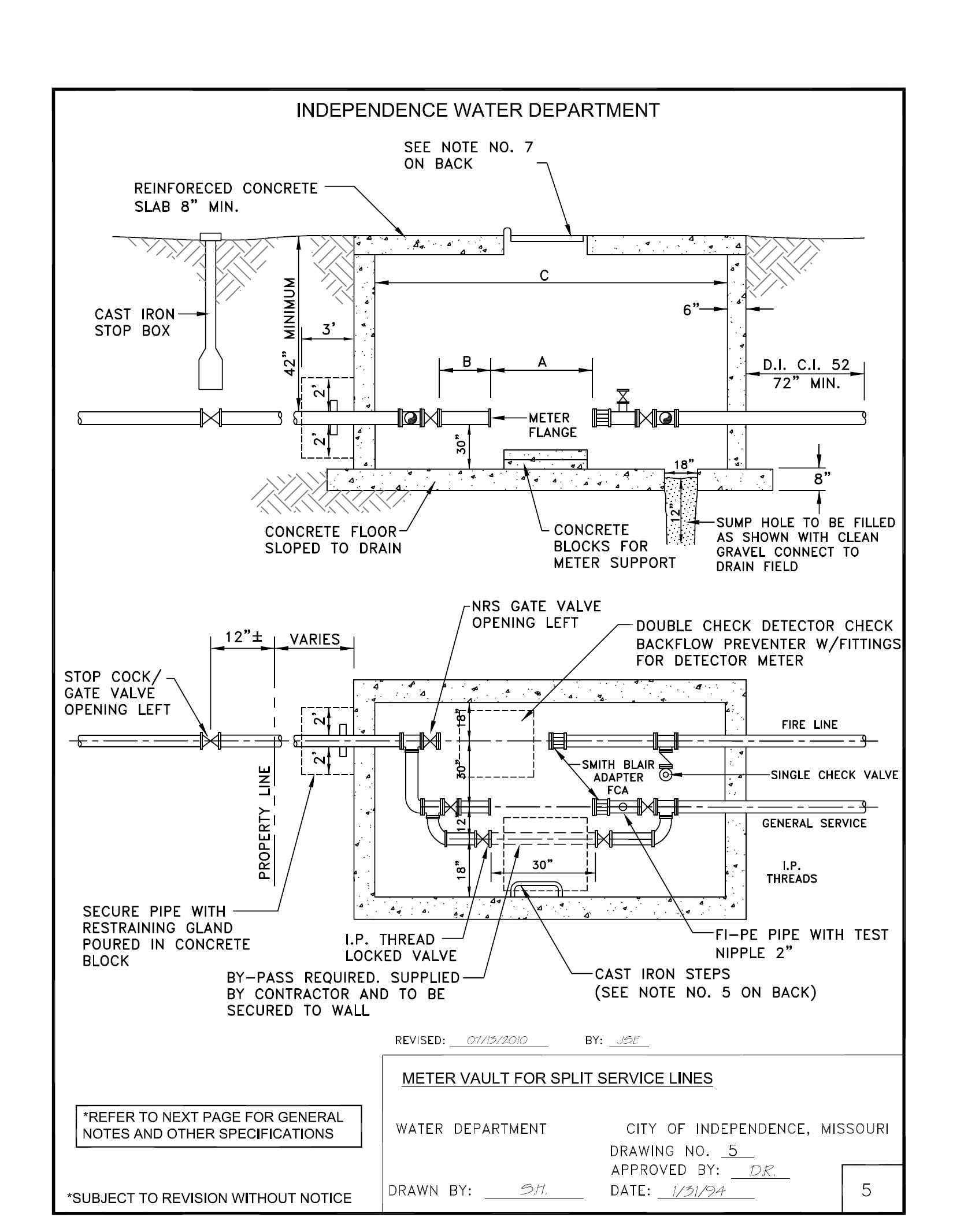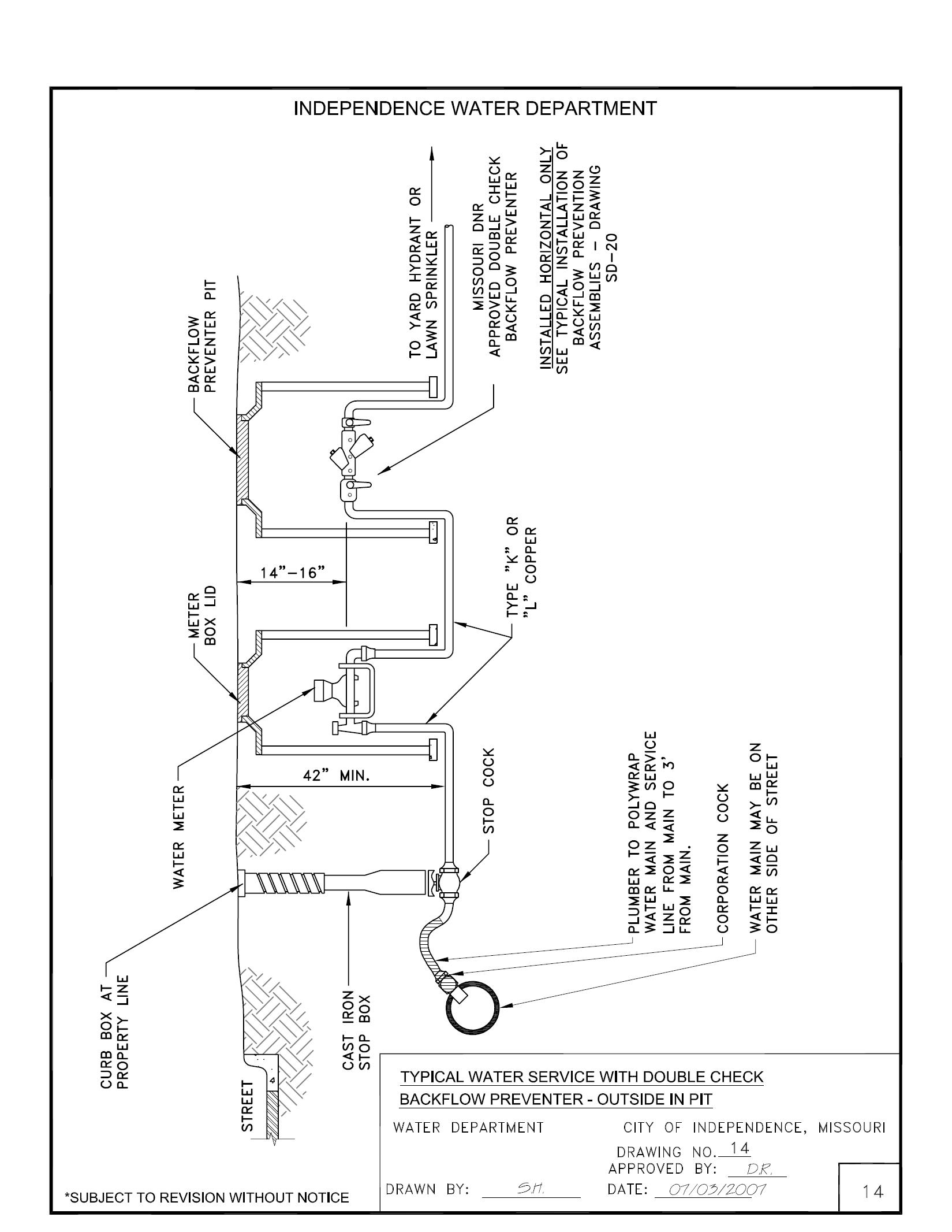 General Index (Cont.) General Description Page No. DRAWING 12 Installation Standards and Requirements for Water Service Line Existing Slab on Grade 12 DRAWING 13 Installation Standards and Requirements for Water Service – Flag or Irregular Shaped Lots 13 DRAWING 13A Curb Valve Replacement Detail –¾" thru 2” Service Connections 13-A DRAWING 13B Meter Vault Riser Detail 13-B DRAWING 13C Meter Well Removal Detail 13-C DRAWING 14 Typical Water Service with Double Check Backflow Preventer Outside in Pit 14 DRAWING 15 Typical water Service with Double Check Backflow Preventer Inside 15 DRAWING 16 Typical Water Service with Reduced Pressure Principle Backflow Preventer Outside 16 DRAWING 17 Typical Water Service with Reduced Pressure Principle Backflow Inside 17 DRAWING 18 Typical Installation of Backflow Prevention Assemblies 18 DRAWING 19 Residential Lawn Sprinkler with Double Check Backflow Preventer 19 DRAWING 20 Missouri DNR Regulation Clause Regarding Backflow Prevention 20