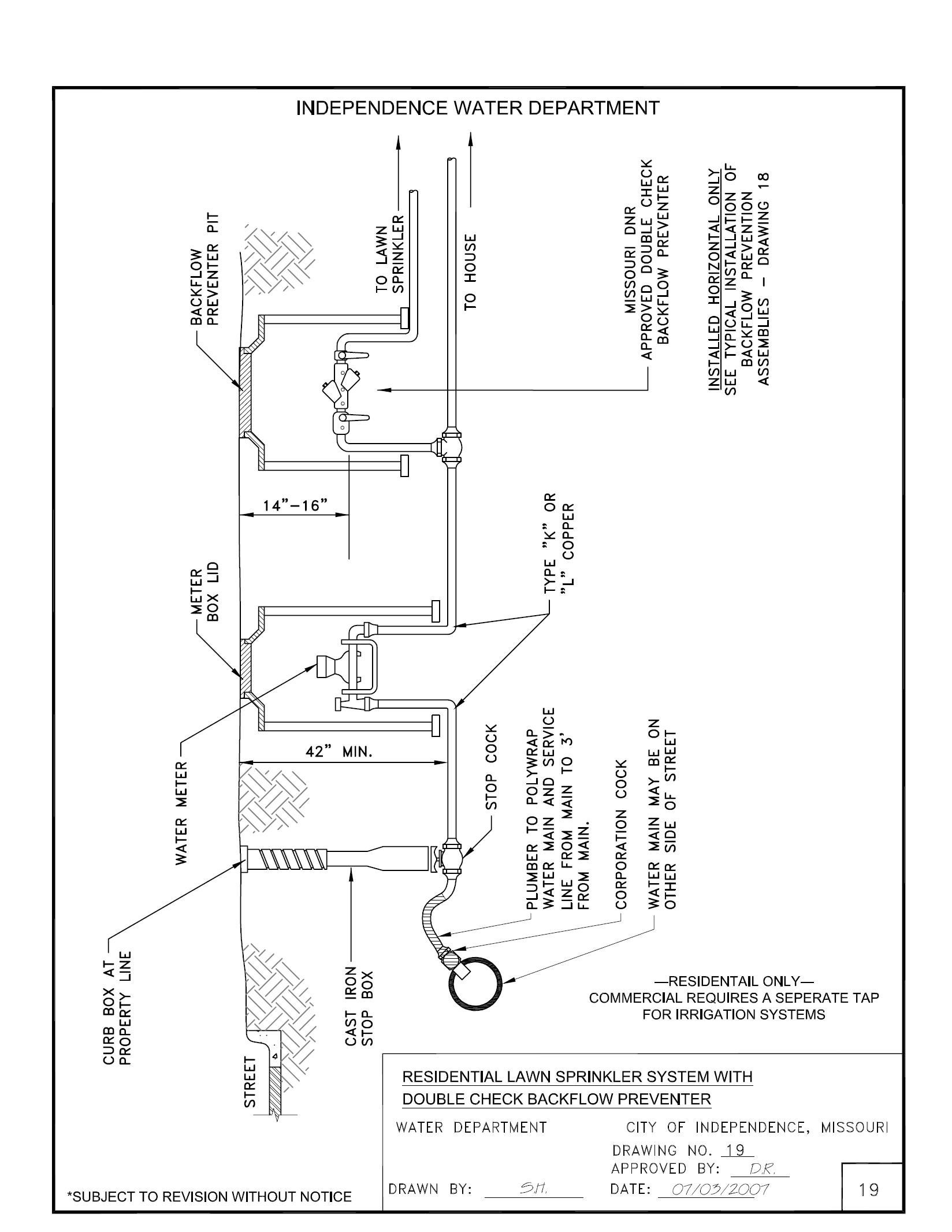 2. All backflow preventers will be installed before any tees or wyes, in a horizontal and upright position. The only exception to this requirement is on a lawn sprinkler system (see Drawing 19).
