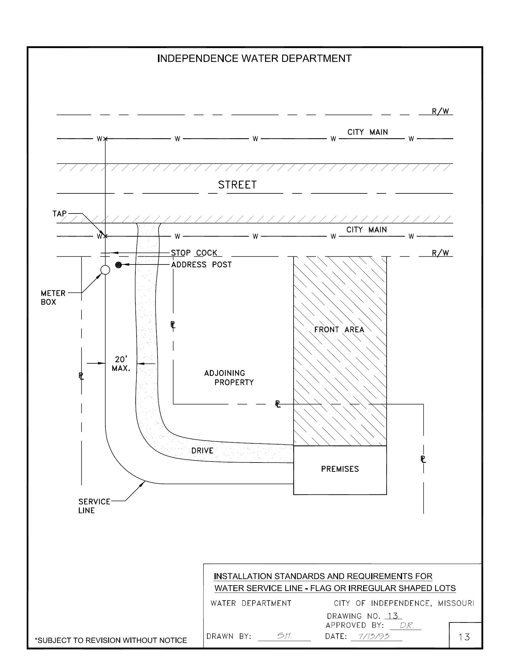 The water service line to a flag or irregular shaped lot must comply with the following (see Drawing 13):