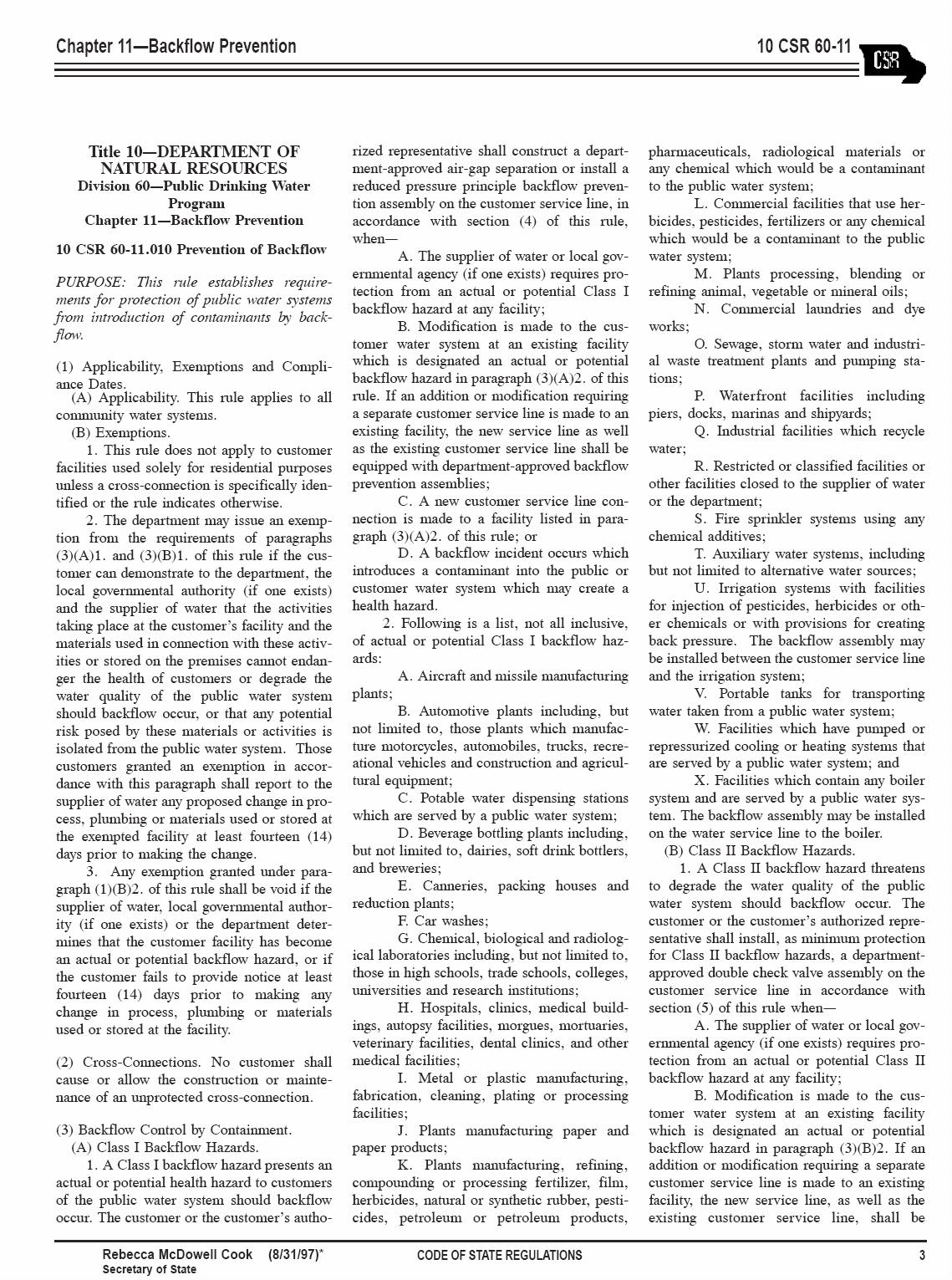 (Division 60 – Public Drinking Water Program; Chapter 11 – Backflow Prevention)