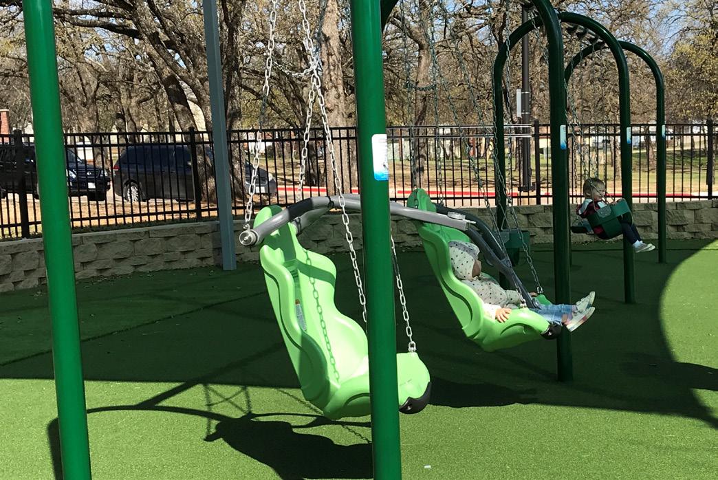 To give children with mobility issues the chance to use swing sets, seats allowing parents to safely secure their child were installed. The seats are oversized to fit larger children and feature lap bars and safety straps.