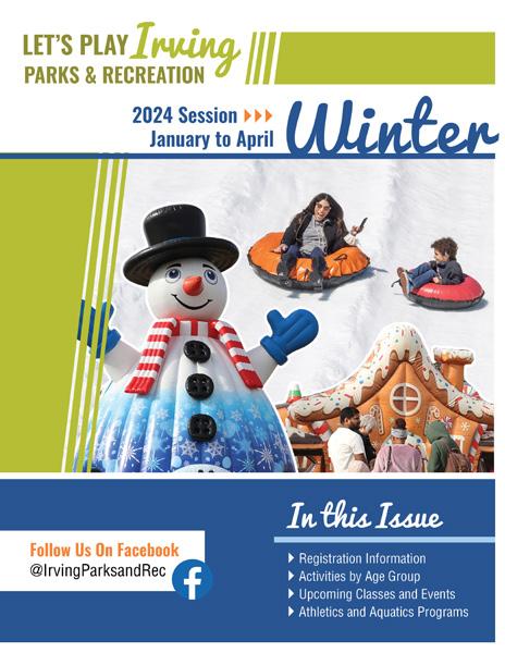 The Irving Parks and Recreation Department’s Winter Activities Brochure is now available! It provides information on how to schedule, sign up and register for the upcoming camps, classes, programs and activities available through April 30. The guide includes schedules by age groups and information for all Irving recreation centers. Pick up the Winter 2023 Brochure at any recreation center or view online at CityofIrving.org/ RecSchedules