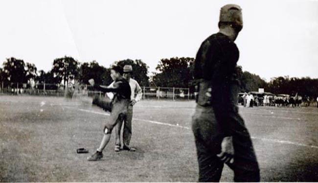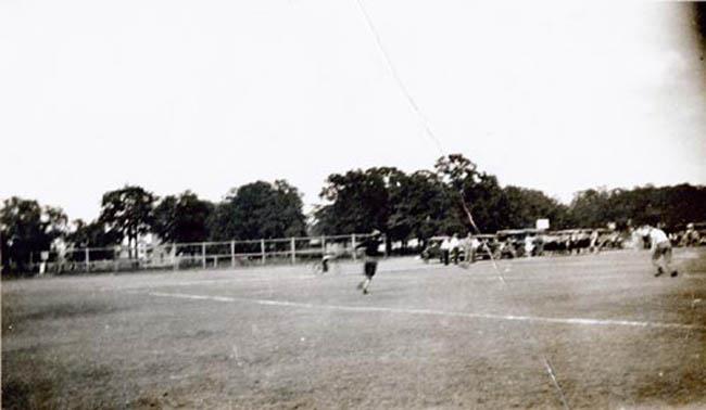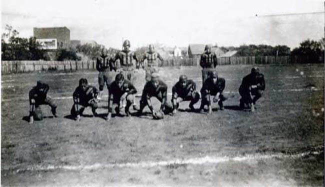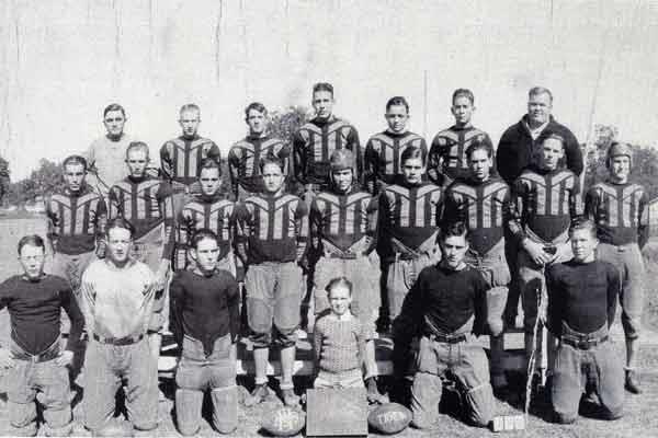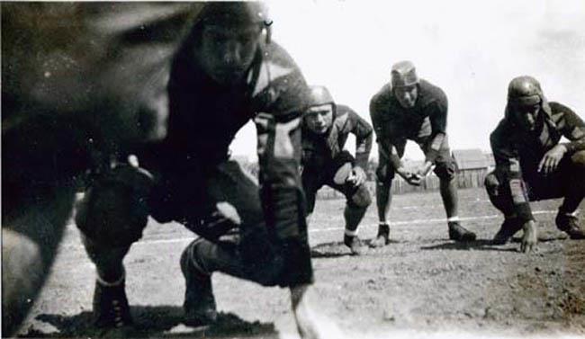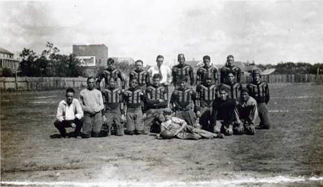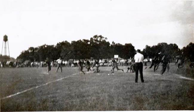 Irving Tigers in action, 1929. The city water tower located behind the city hall building on Second Street is visible in the background.