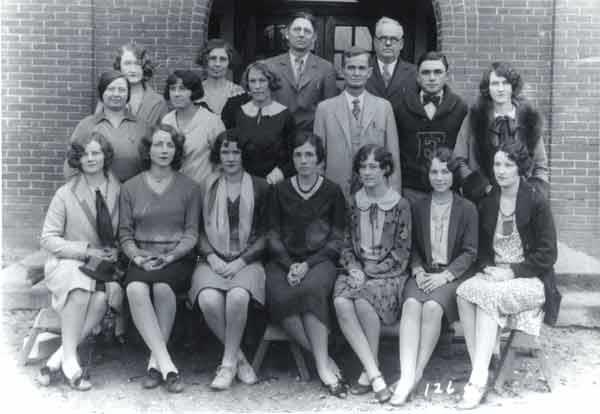 Irving School faculty, 1929-30: Back row: (l to r) Helen Hopkins, Mrs. Harkey, Mr. Elder, Superintendent A. S. Johnston.