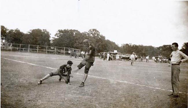 Irving High School football team player Albert "Bubba" Anderson makes a run during a game in Irving, 1929. The field was located on the south end of the school grounds. The three story school building, "Old Red," can be seen among the trees in the center left background.